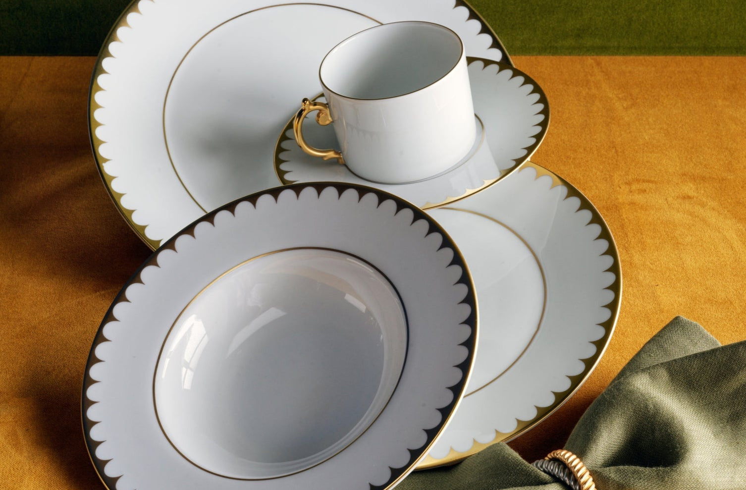 Mirroring the waves of its namesake sea, Aegean Filet dinnerware features a timeless pattern of scales in a delicately scalloped border, hand-applied in 24K gold.Please Allow 08 to 10 Days for Shipping.