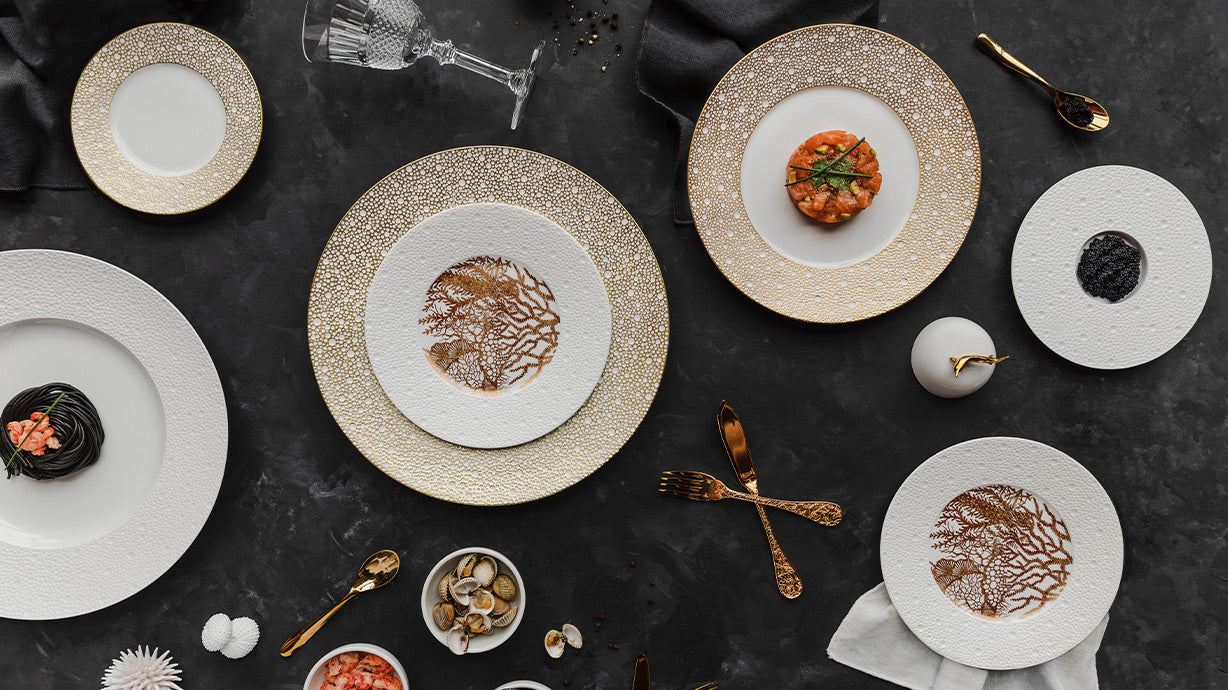 Which recreates the look of foam through subtle textural contrasts and skilled glazing work. The plate rim is decorated in gold with hollows engraved in white, producing a poetic, contemporary effect. The Ecume mordoré collection will give your dinner table an aura of modern elegance. This Collection is under a special order. Should you need some item by a certain date, please Contact Us and we will try to accommodate your request.
