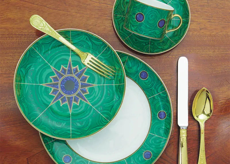 Tony Duquette, "American Design Icon", designed these plates featuring panel cut stone, which have been painted in a playful way. The powerful colors make a bold statement and the gold, a serious touch of elegance.