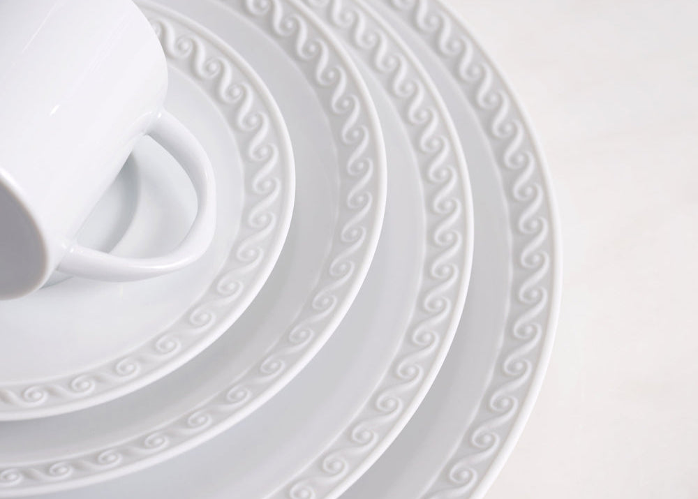 Inspired by the timeless beauty of the sea, this neo-classical motif is meticulously crafted from fine porcelain, sculpted in bisque to echo the gentle waves of the Mediterranean.Please Allow 08 to 10 Days for Shipping.