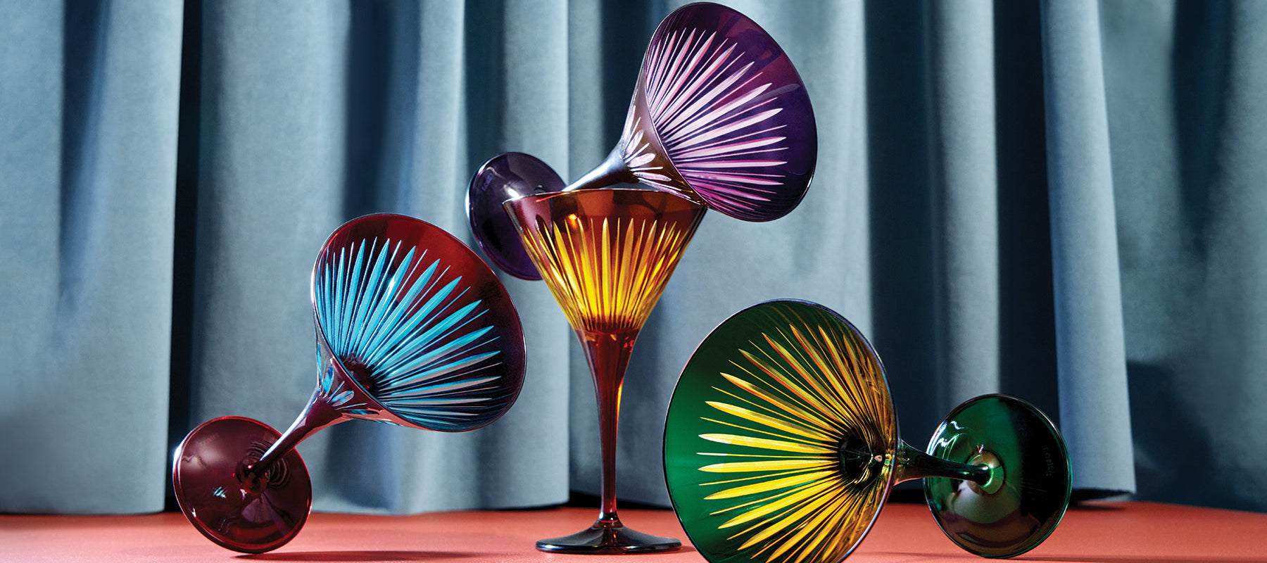 A glassware collection of bold color combinations, hand-cut and decorated to playfully reflect light.Please Allow 08 to 10 Days for Shipping.