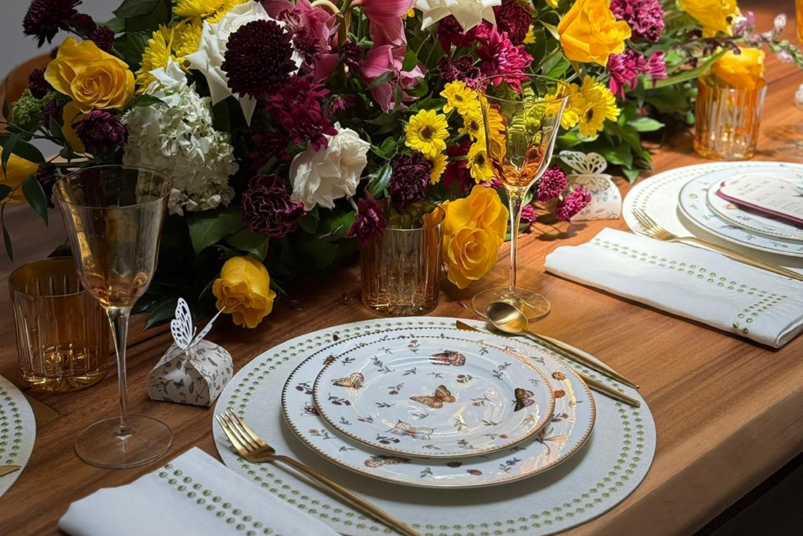 Golden glasses, pearl details, and gold cutlery styled with Primavera plates for an elegant, refined table.