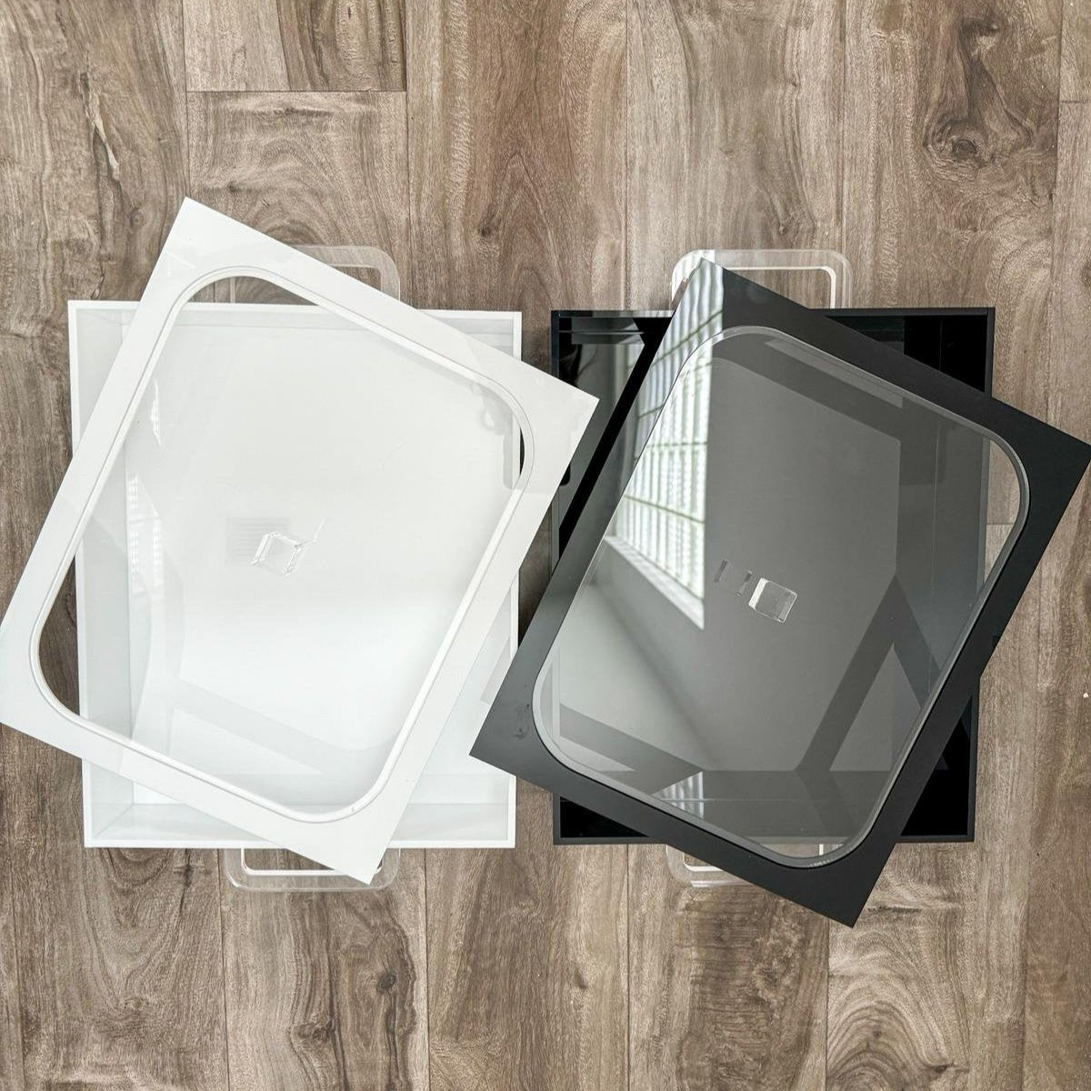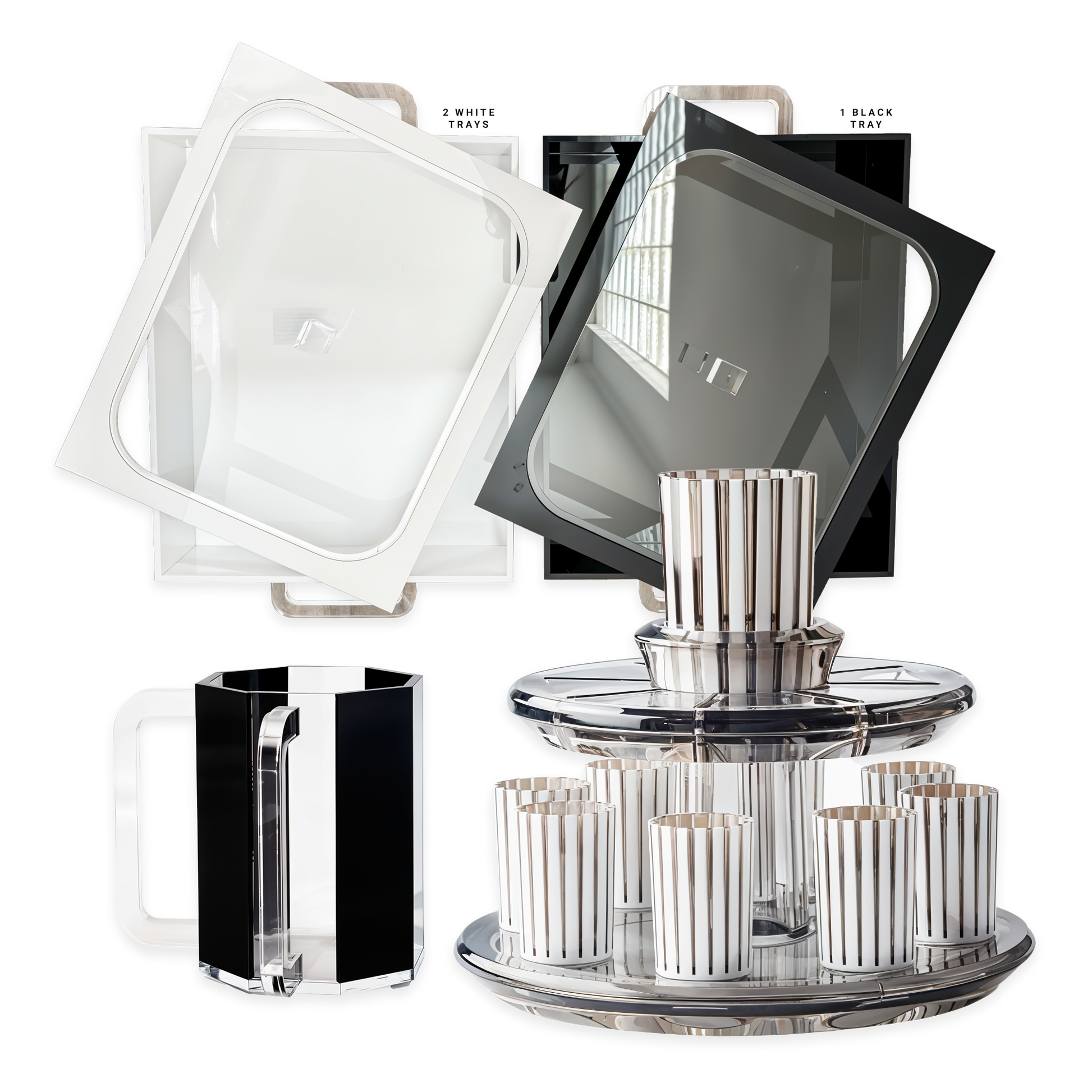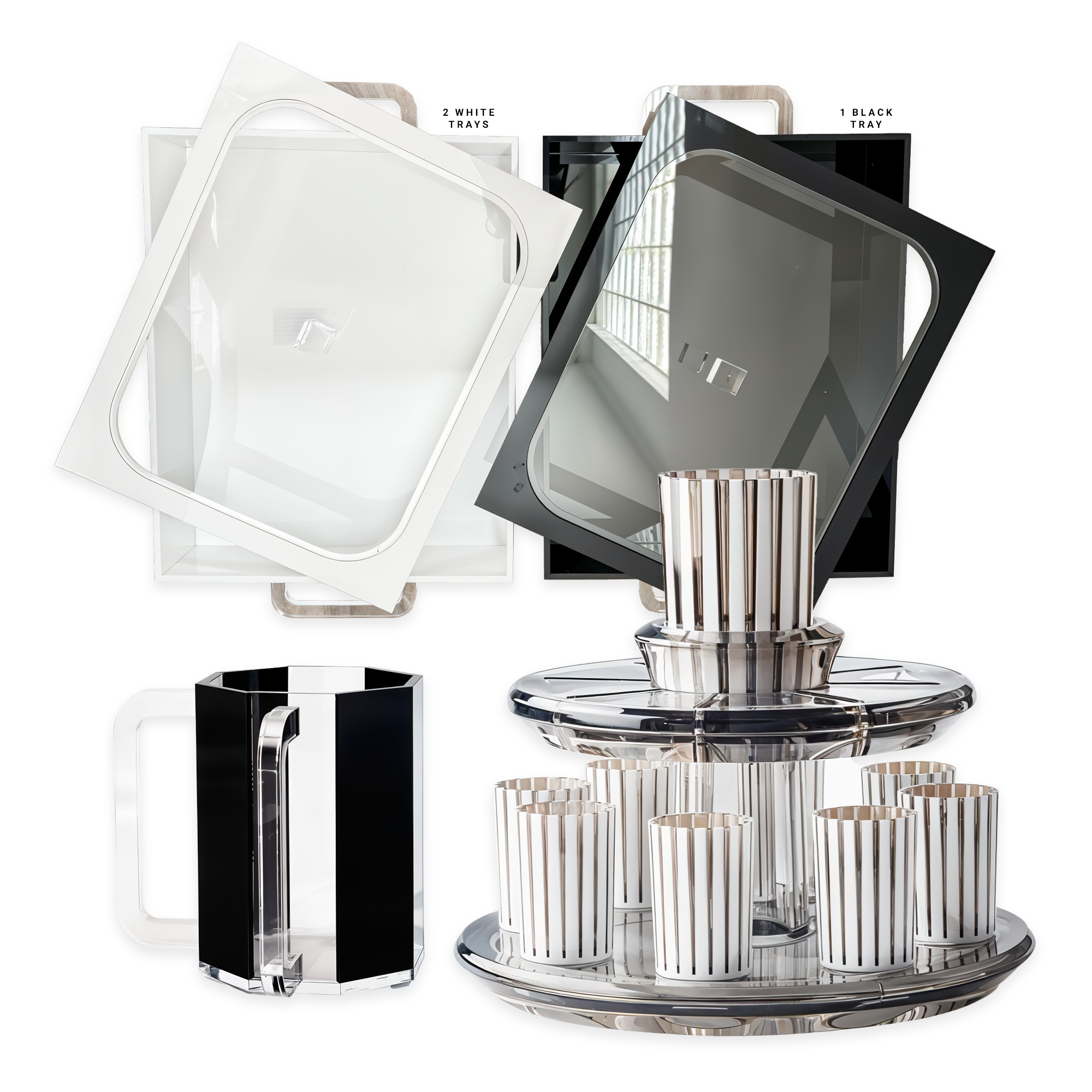 The Elevated Kiddush & Serving Set – 1 Kiddush Wine Fountain (Smoke & White, Set of 10), 3 Aluminum Tray Holders (White/White/Black), 1 Black Netilat Cup added to cart!