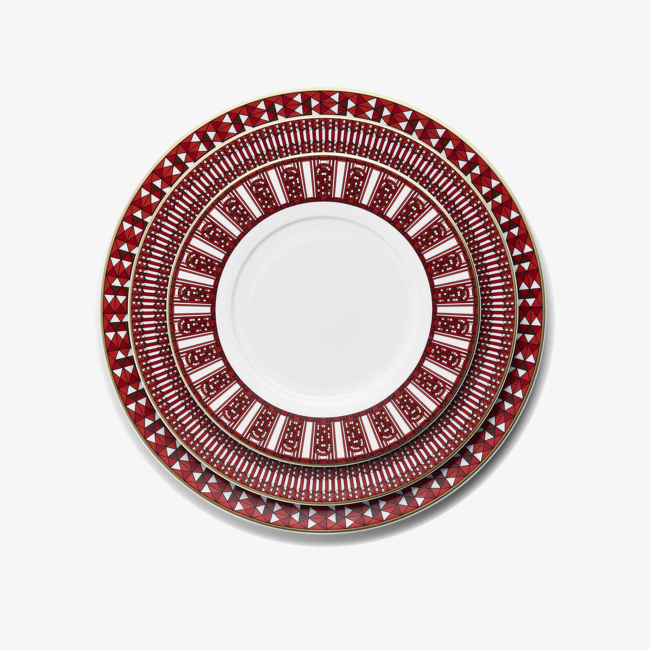 The Arcadia Red collection is a porcelain service comprising four sizes of plates and a “timbale”. Adorned with the Arcadia pattern, the dazzling white porcelain is enhanced by Baccarat's signature red and precious touches of gold. An ode to joie de vivre, the Arcadia Red service harmonizes vibrantly with Baccarat’s crystal creations, accompanying moments of sharing and celebration. Arcadia is the pattern inspired by the arched windows of Baccarat’s Manufacture, celebrating what happens behind them, where for generations, passionate artisans have been creating outstanding masterpieces to enchant the world.