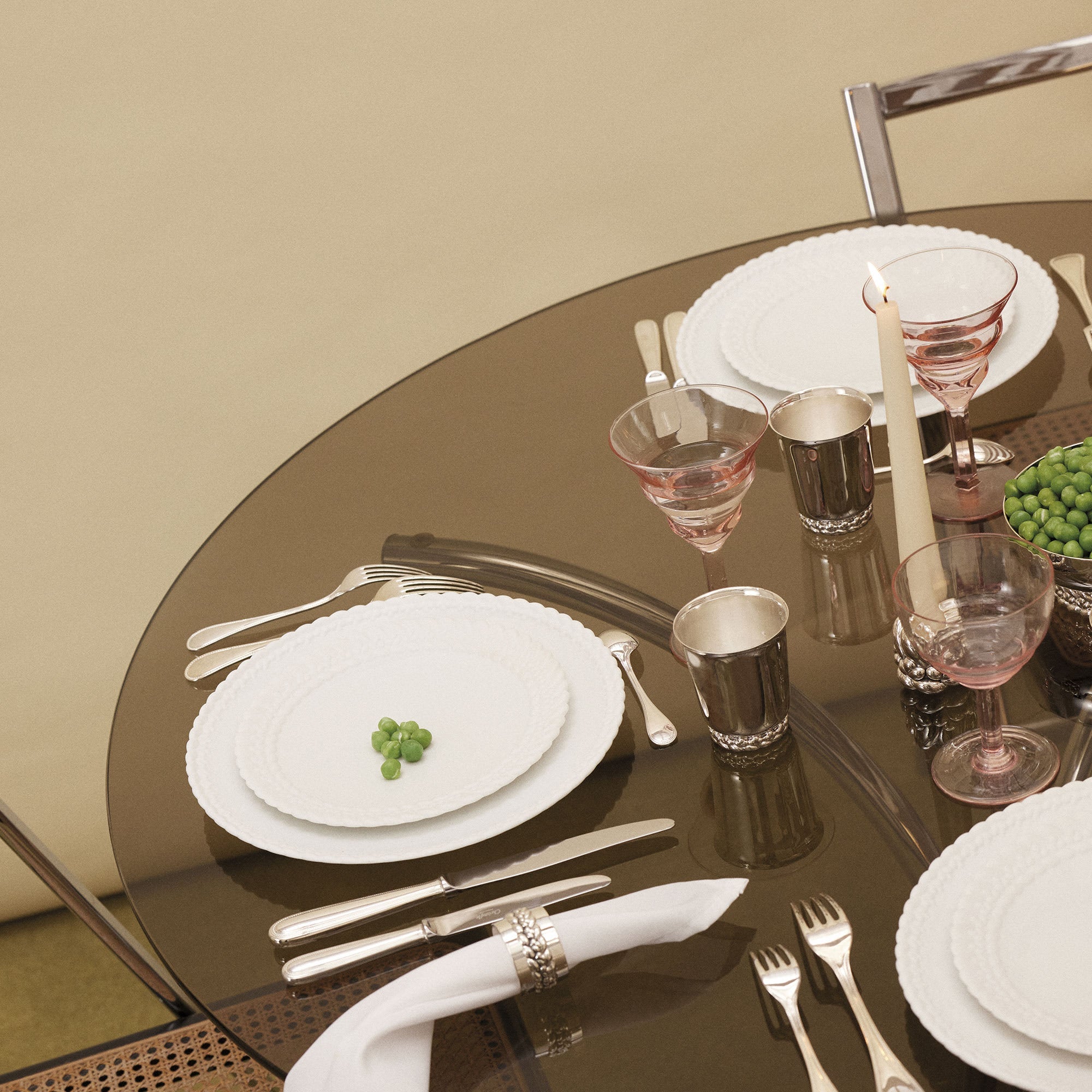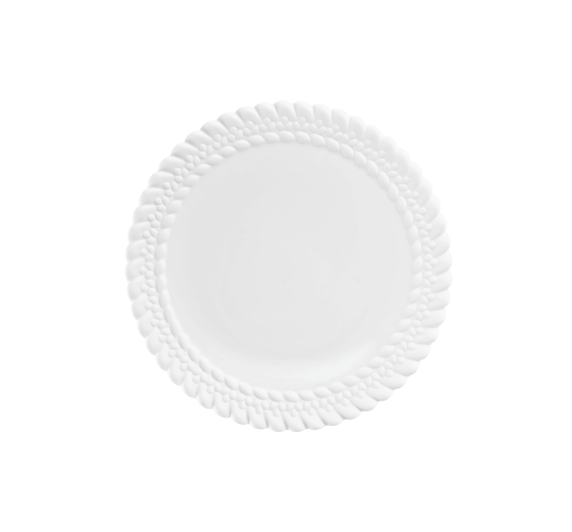White porcelain dinner plate delicately surrounded by the Babylone braided pattern in matte porcelain for a soft play of contrast. Completely hand-crafted in France, its finesse, density and transparency are the hallmarks of exceptional porcelain.