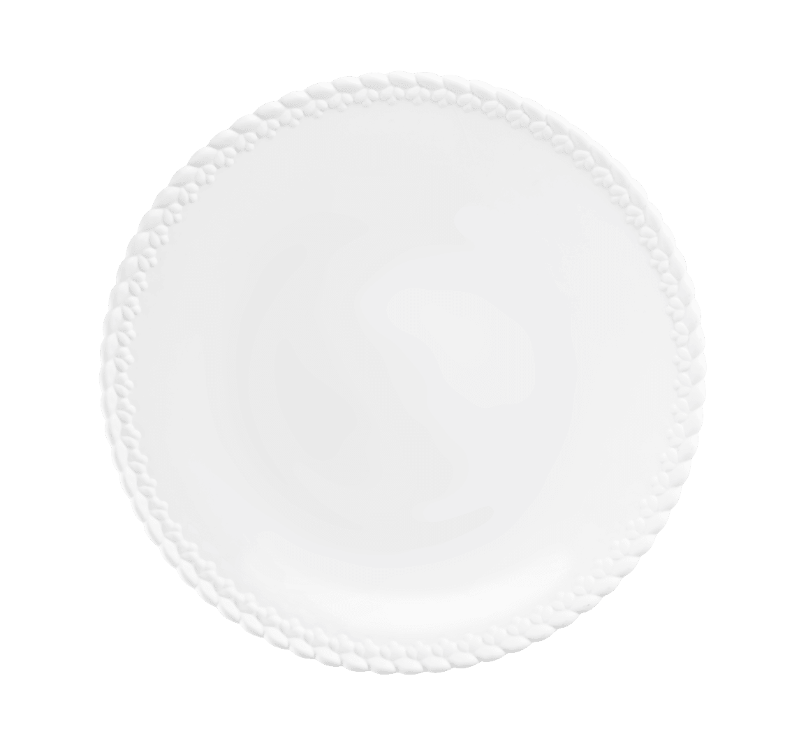 White porcelain dinner plate delicately surrounded by the Babylone braided pattern in matte porcelain for a soft play of contrast. Completely hand-crafted in France, its finesse, density and transparency are the hallmarks of exceptional porcelain.