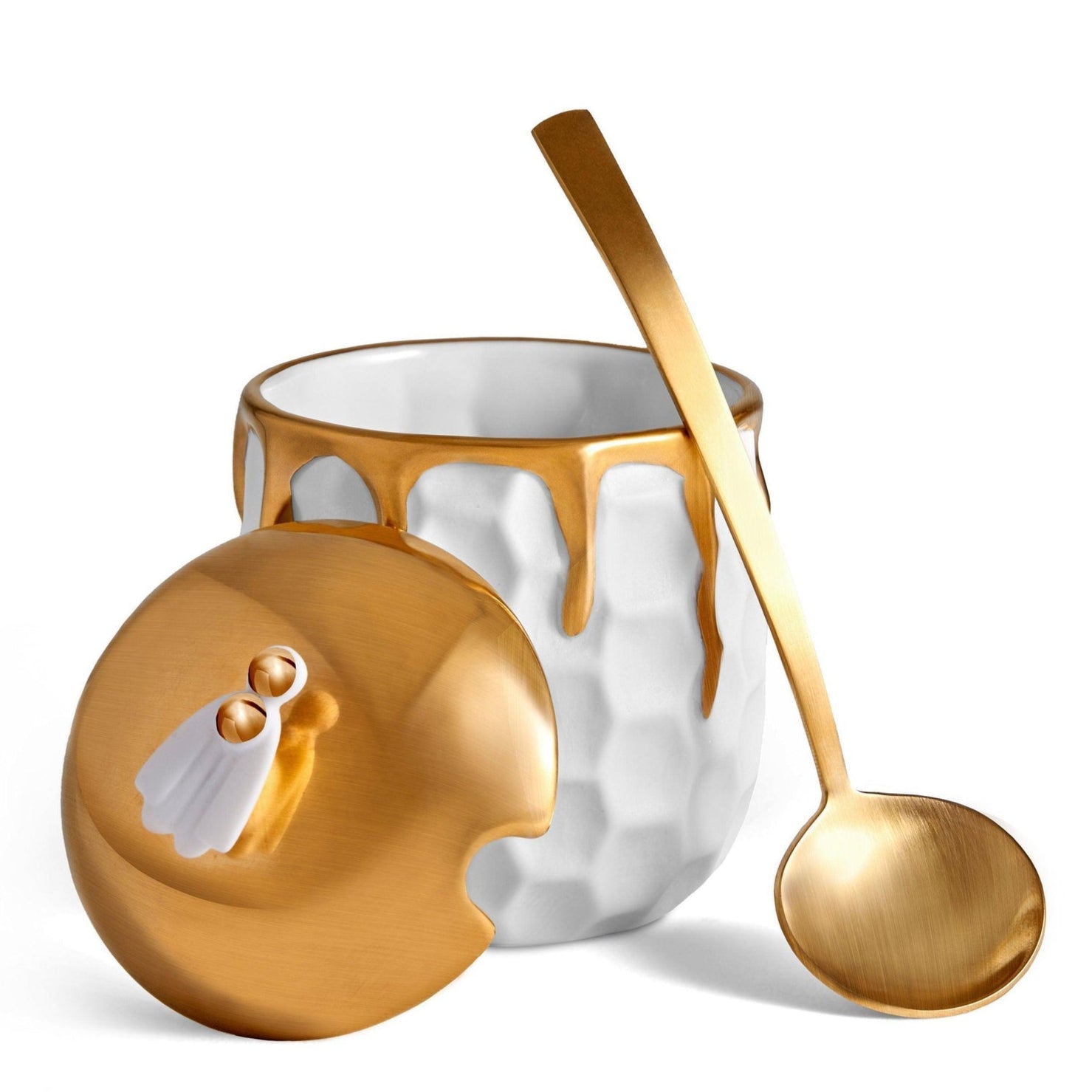 Porcelain honeypot contrasts the timeless geometry of the honeycomb with hand-gilded drips of 24K golden honey. Includes 24Kgold-plated spoon.