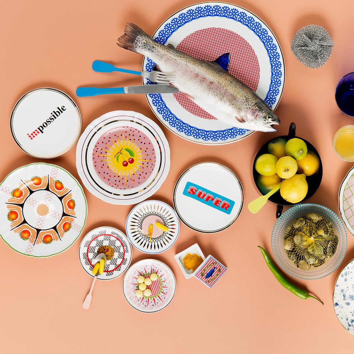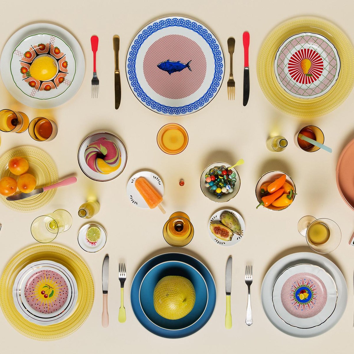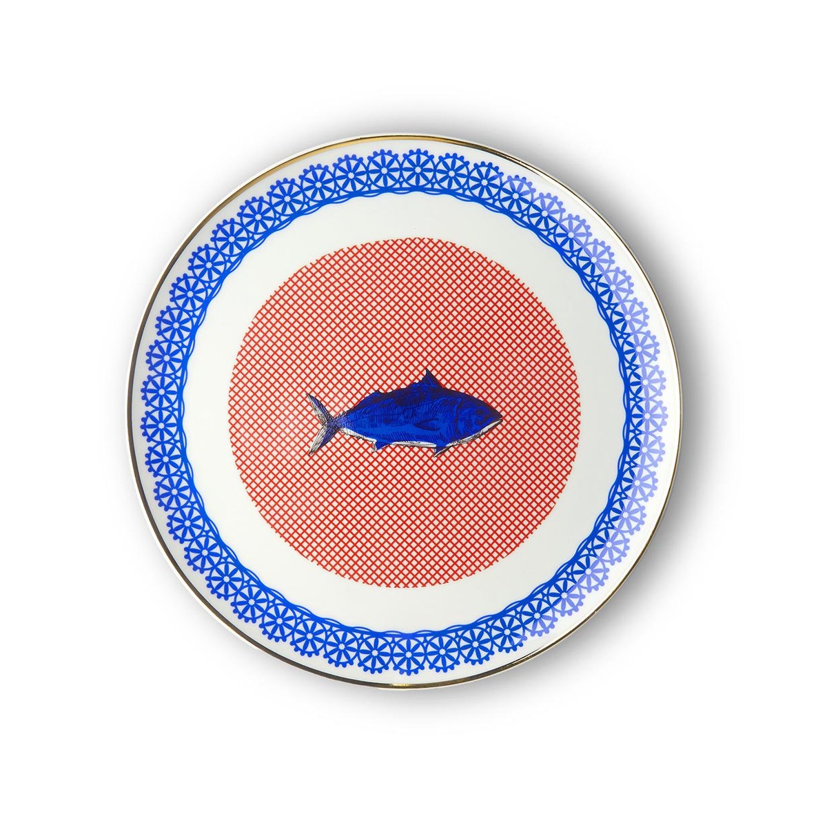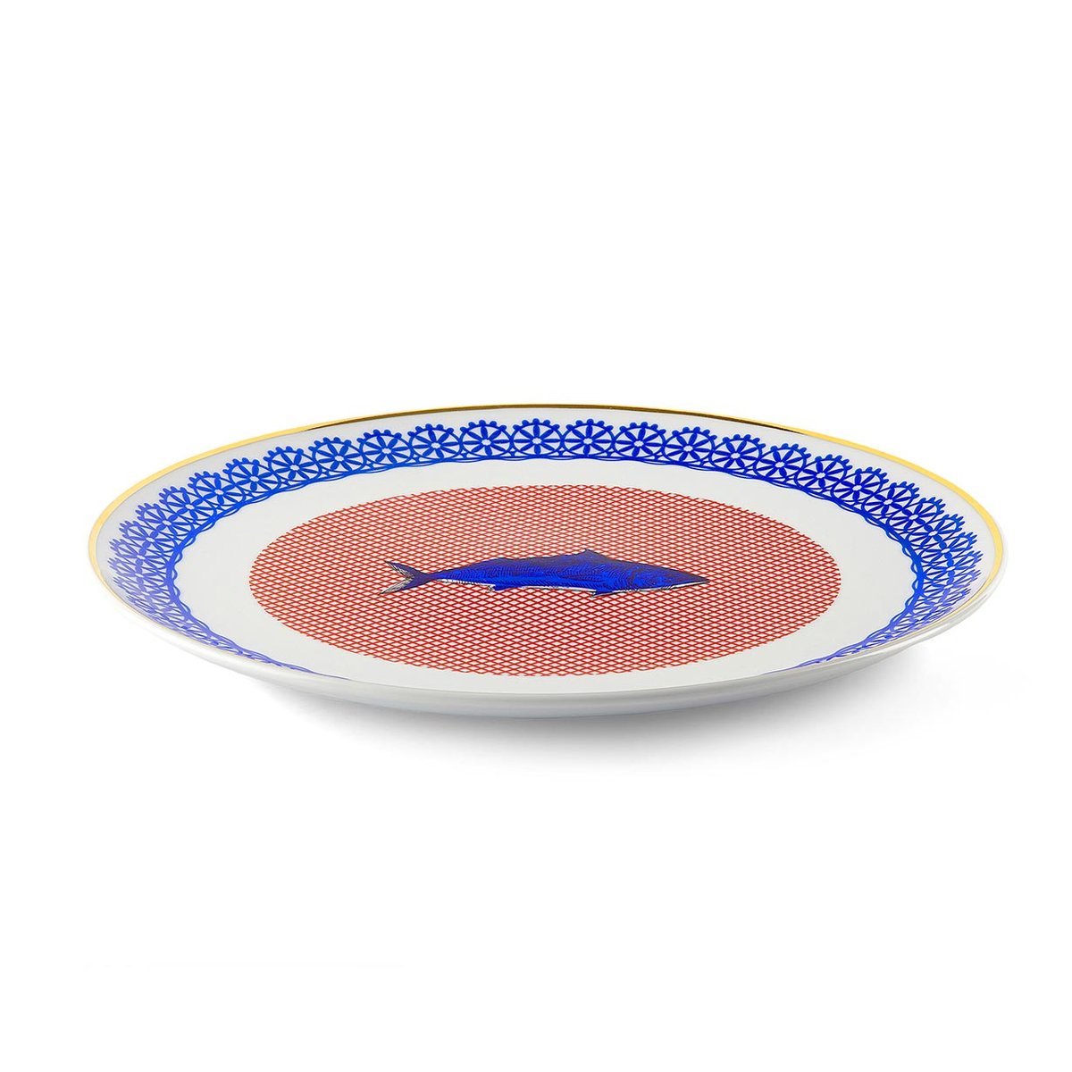This serving plate is made of porcelain with a gold profile. In the center it features a blue fish surrounded by a bright red texture. Due to the presence of the gold decoration, it is not recommended to wash the dish in the dishwasher. Set your table with the colors and flavors of the Bel Paese line created by the French art director and graphic designer Sam Baron. Not microwave safe
