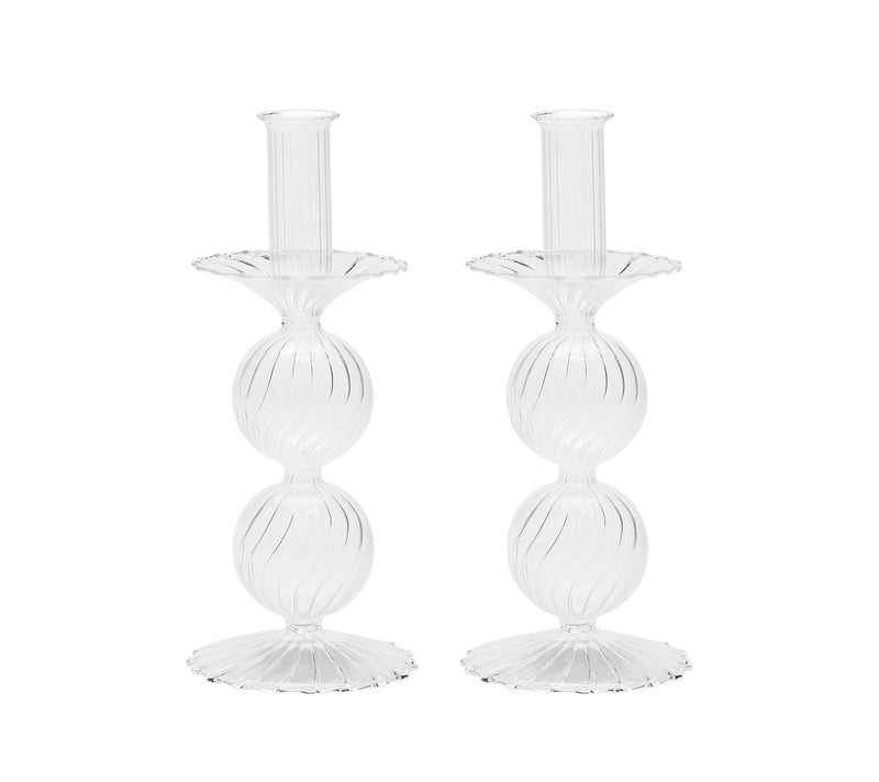 The delicate, hand-blown glass Bella Candlestick features two stacked globes atop a scalloped base. This stunning glass candlestick adds movement and sophistication to any table.