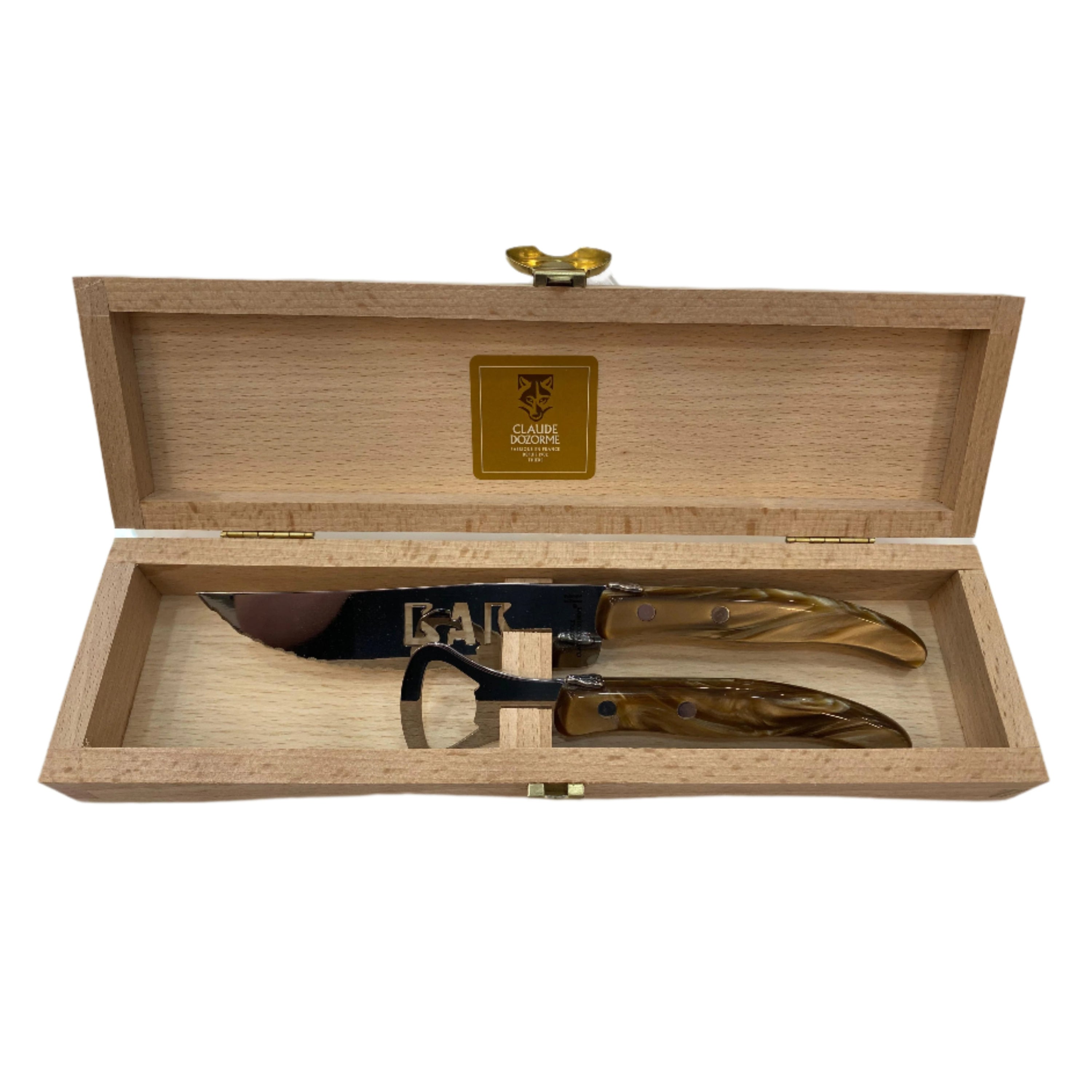 BAR Set in Elegant and Functional Wooden Box, this set includes a knife with the BAR inscription and a bottle opener, both designed to add style and utility when serving. Presented in a refined wooden box, it is the perfect detail for those who appreciate good taste and practicality.