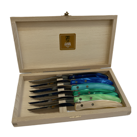 The Claude Dozorme Berlingot Box features a set of 6 knives with handles made of high-quality beech wood in a stylish blue and green color combination.