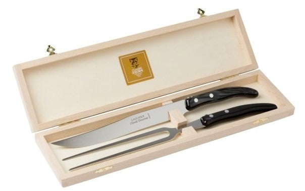 Ideal for use tableside during Sunday roasts or special occasions, this 2-piece Carving Set from Claude Dozorme offers a razor-sharp knife to effortlessly slice meat and a fork for stability as you carve. Its classic carving knife and natural resin handles combine for optimal precision and comfort, with a hand-carved 'spine' and the signature Laguiole bee emblem sitting atop for assurance of quality. Full-tang and triple riveted for increased strength, this exquisite set is presented in a premium beech wood case, making it a great gift.