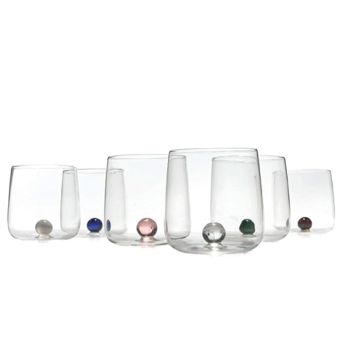 Bilia was born from an idea of the Venetian designer Federico De Majo, founder of the Zafferano brand. This Set consists of 6 Tumbler glasses in Borosilicate Glass with a sphere inside that recalls the marbles we used to play with as children. Borosilicate is a light artistic glass and very resistant to thermal shock, also suitable for daily use. The Zafferano collections are mouth blown and hand crafted. Bilia is a new concept of glass with an original line, one of a kind, suitable for a stylish Mise en place with a suggestive aesthetic impact. Inside each glass there is a real glass marble.