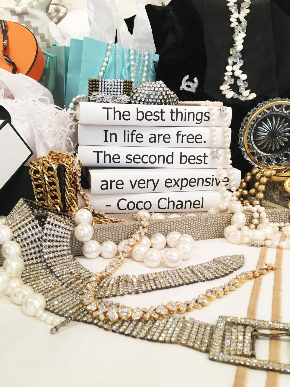 Decorative book stack - 5 Vol. Coco Chanel "The best things in life..." Black Covers9.5" wide / Approx. 6.25" tallPhoto courtesy of Topography Home