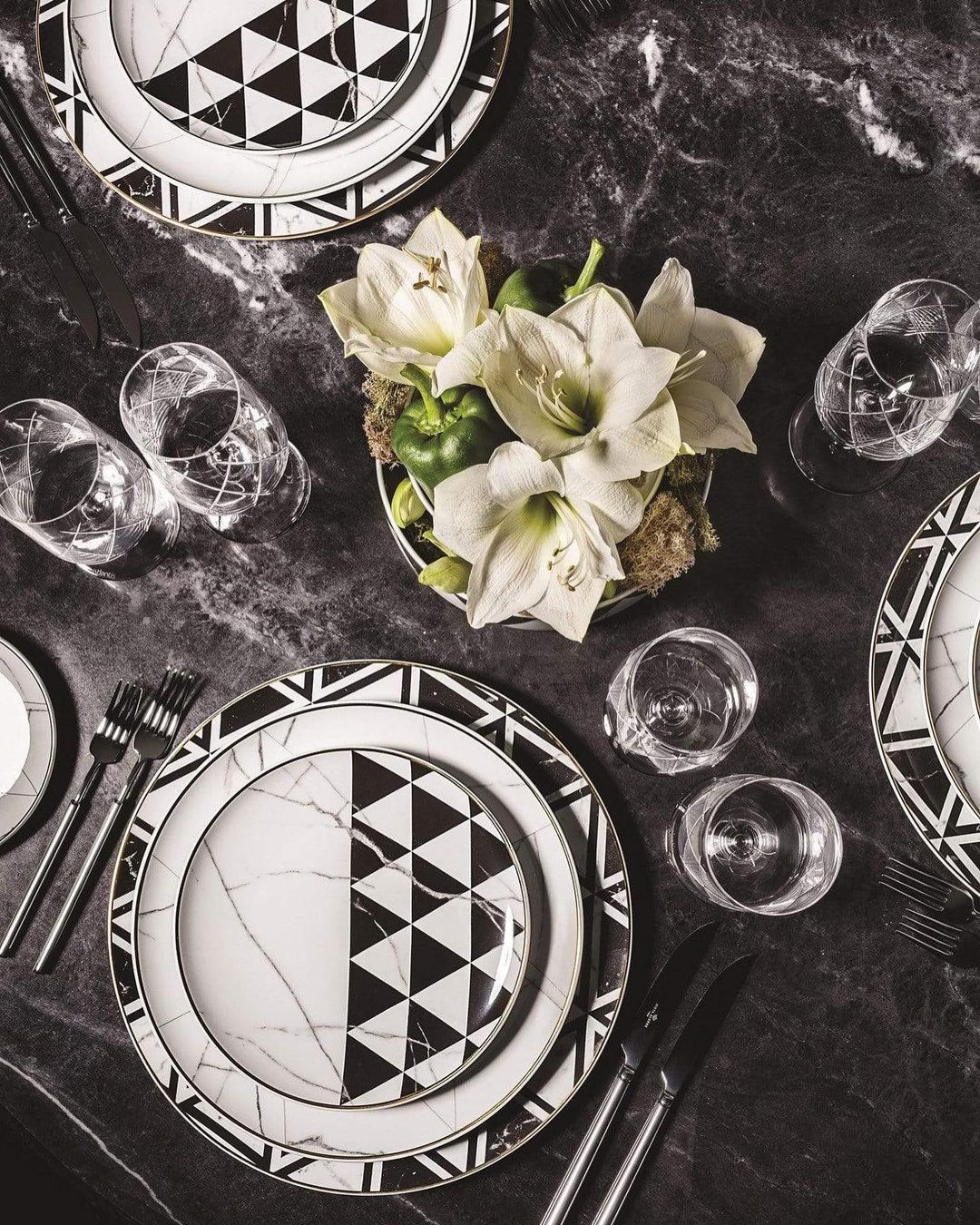 The combination of porcelain and drawings inspired by Carrara marble. with a refined geometric approach. creates the illusion that each piece in the set is interchangeable.