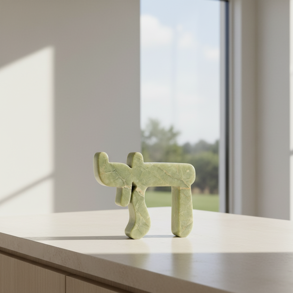 Handmade ‘Chai’ stone sculpture. ‘Heth’ and ‘Yudh’ - the intersected glyphs - represent the unity of the Jewish people everywhere.Size 6” x 7”Each piece is unique - colours and swirls will vary.