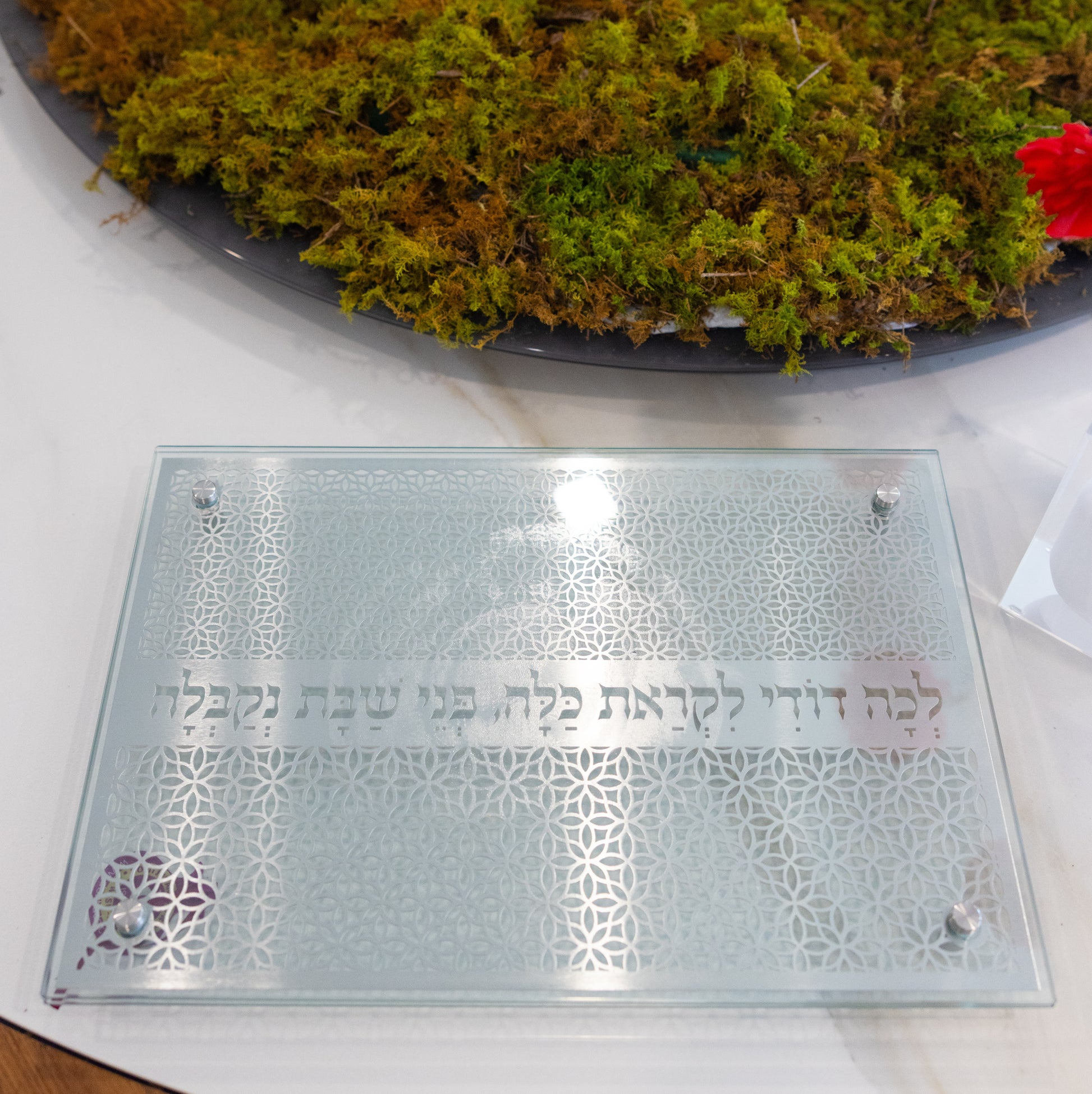 The incorporated text is from the famous Erev Shabbat song "Lecha Dodi": Let's go, my beloved, to meet the bride, and let us welcome the presence of Shabbat.