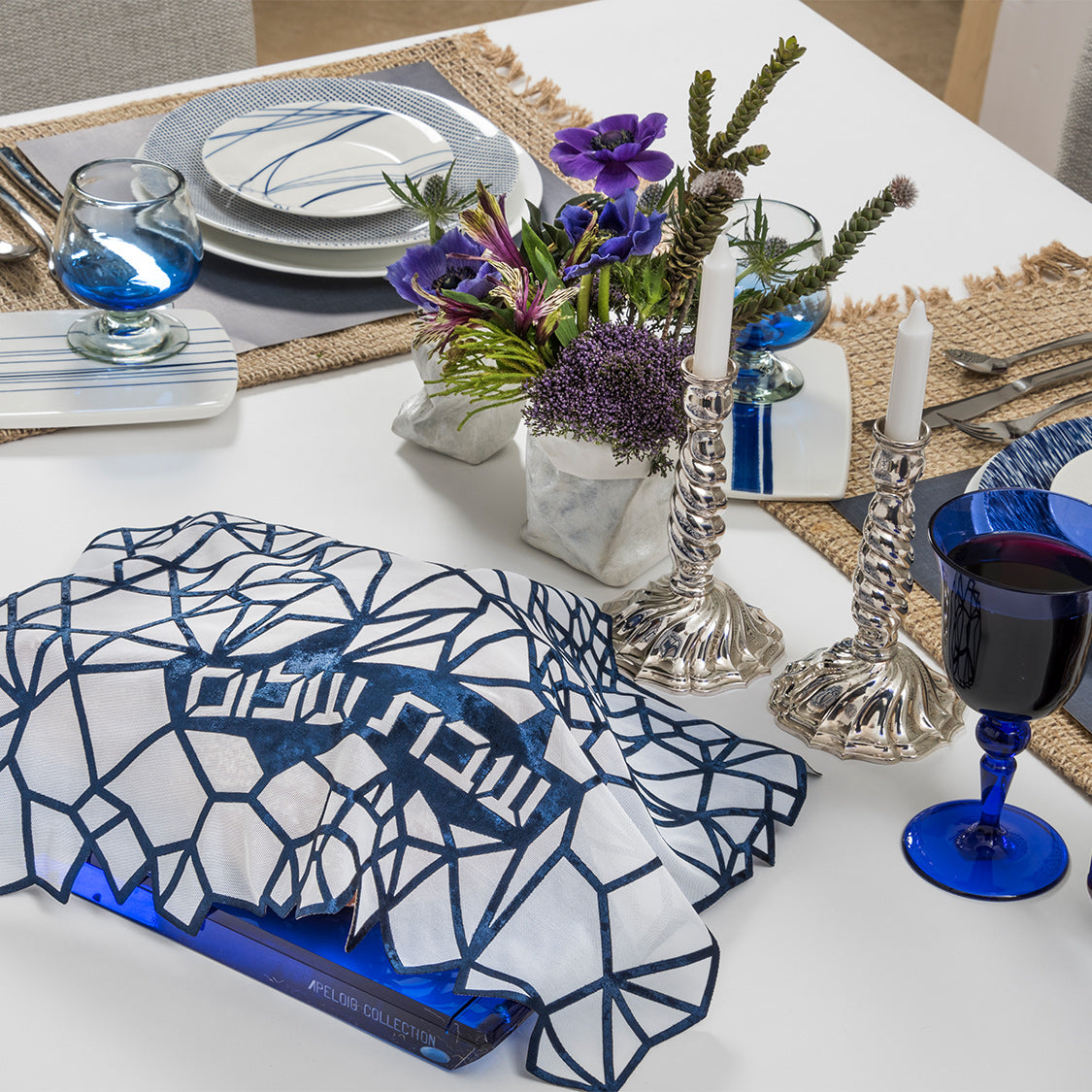 Tradition meets design once again in our Laser-cut Challah Cover. For this contemporary cover, we’ve created a design that starts with our original star of David pattern and morphs into scattered geometric lines; also including the Hebrew words "Shabbat Shalom". Fabric is laser-cut and placed on top of translucent tulle to ensure the challah bread remains covered during the blessing of the wine according to Jewish law.