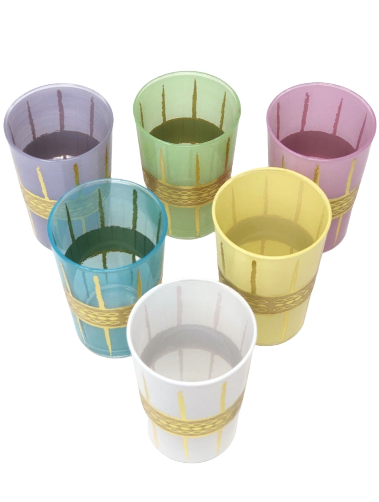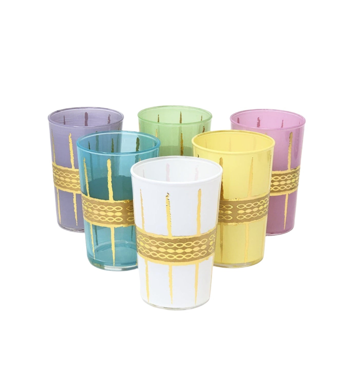 Adorn your table with this set of 6 assorted colors Moroccan tea glasses with this fun gold design.Perfect as a tea, coffee, juice or even wine glass, it can also be used as a votive or a bud rose vase.