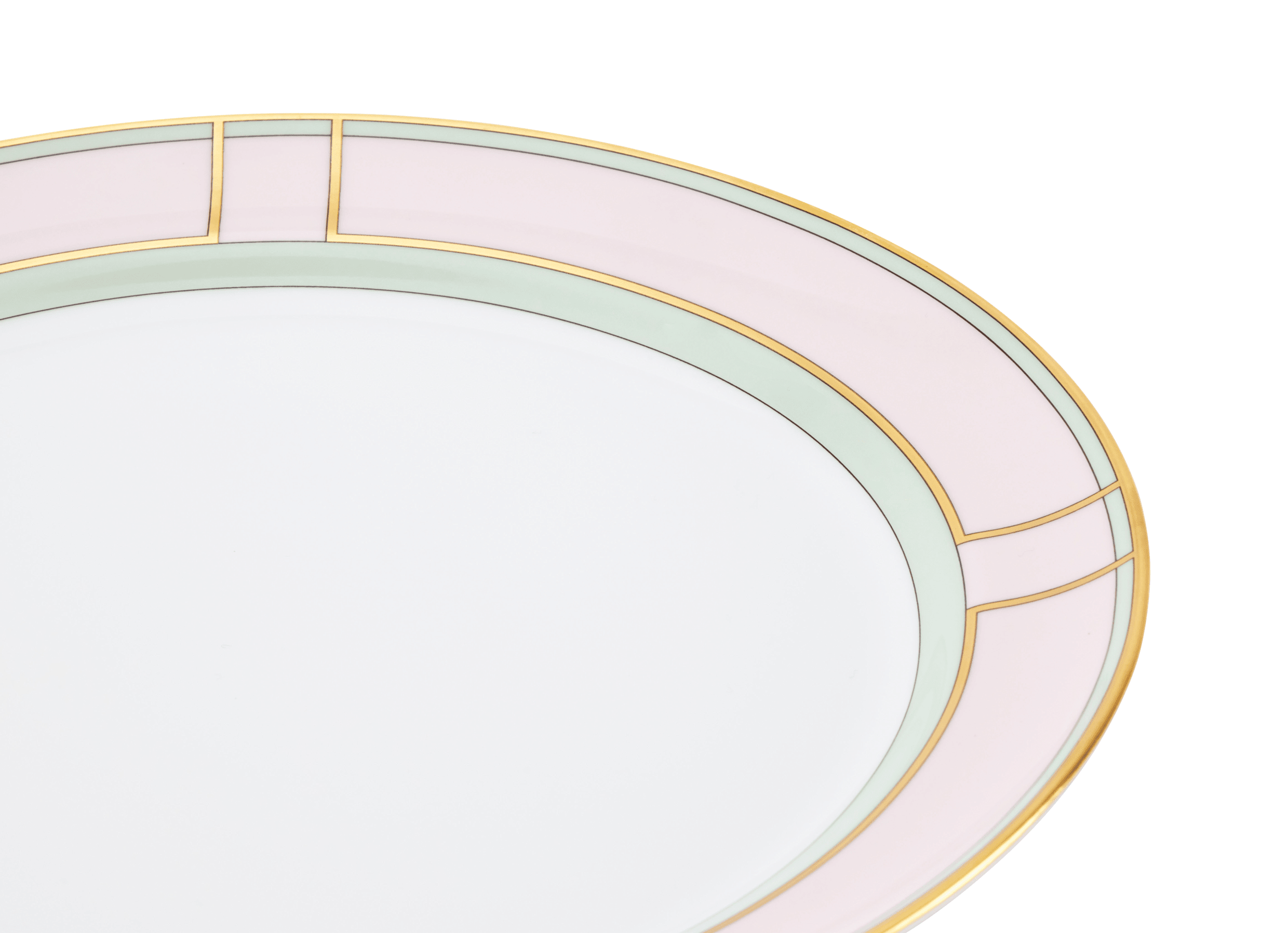 Fine porcelain decorated in pale pink, adorned with a sophisticated green border design and finished with exquisite gold threading. They complement the service alongside soup, bread, and dessert plates from the same line, all of which are available in four pastel colors specifically designed to be mixed and matched. The complete service is outlined by the contours of Colonna, iconic shapes comprising the iconic mid-1950s collection by former Manifattura Artistic Director Giovanni Gariboldi to be stackable and therefore stowable in small spaces. Diva is a porcelain collection available in tableware, tea, and coffee sets as well as an assortment of fine gifts that reflect the glamour of the past with contemporary flair as they take inspiration from the fabled atmosphere of 1950s cinema and the divas who dwelt in the spotlight.