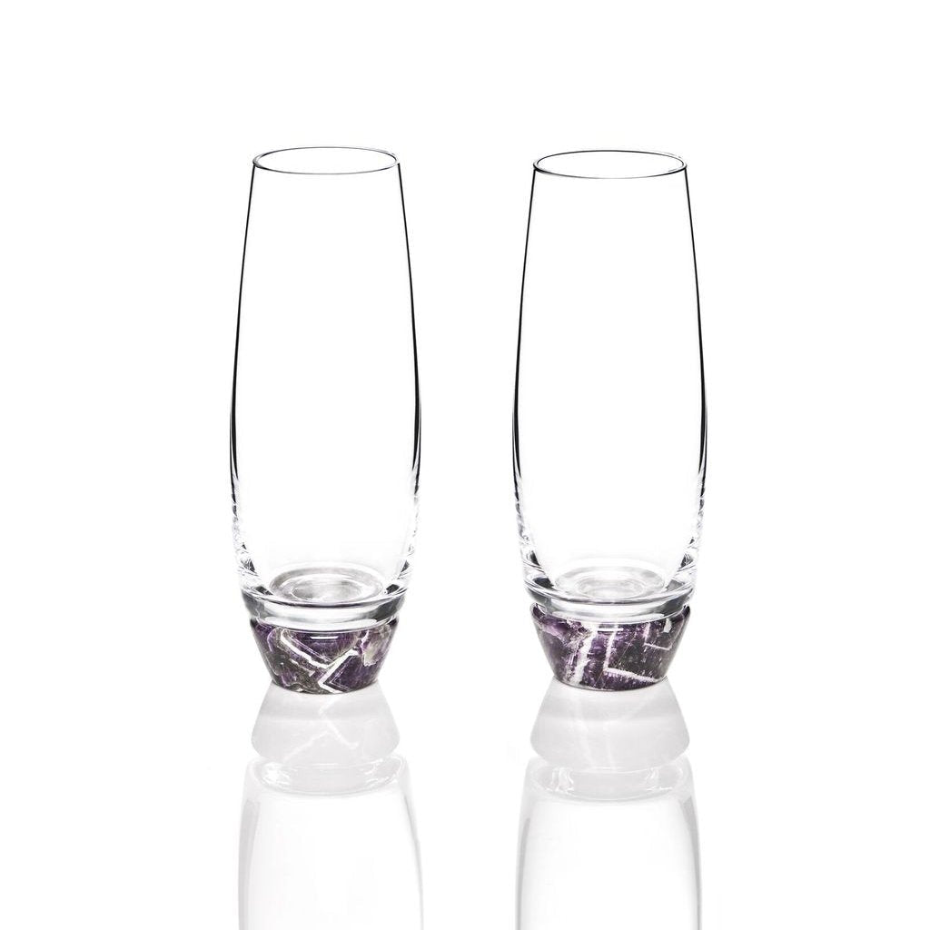 While designed to hold bubbly, our Elevo champagne glasses welcome all sorts of beverages. Expertly crafted from lead-free European crystal inset into semi-precious gemstones, these glasses will elevate your bar and your attitude (especially after hours of Zoom meetings).