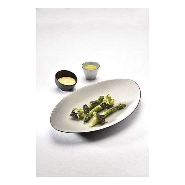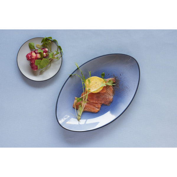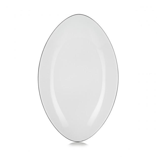 This oval Equinoxe plate reflects our wish to produce a special plate for your very finest recipes. It is ideal for serving meat, whole fish and main dishes. With its flat bottom and slightly raised edges, this plate will bring the elegance of high-quality cuisine along with ease of service thanks to a large usable surface. A fine enamel line is hand-drawn around the edge to perfectly set off the plate's contours and enhance your ingredients.