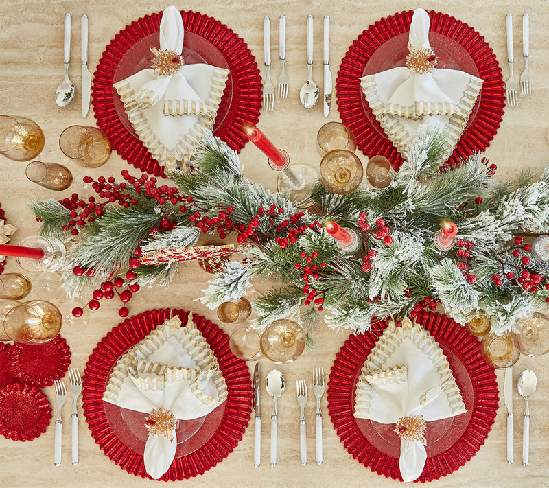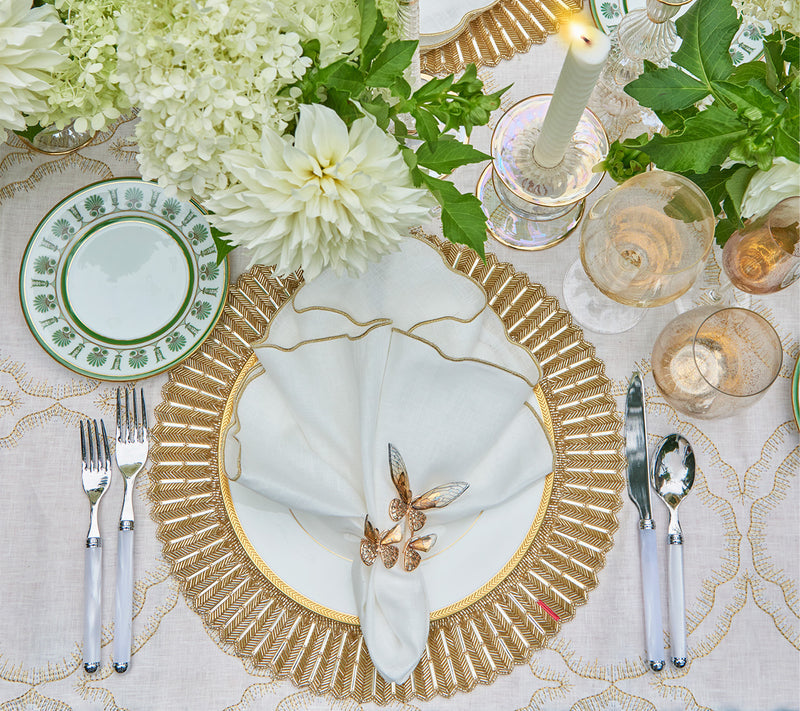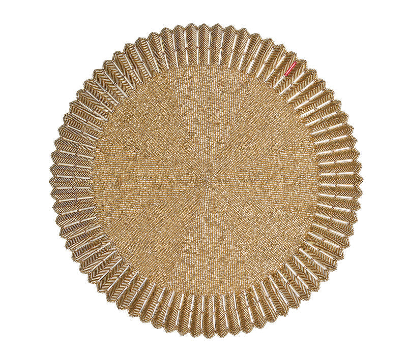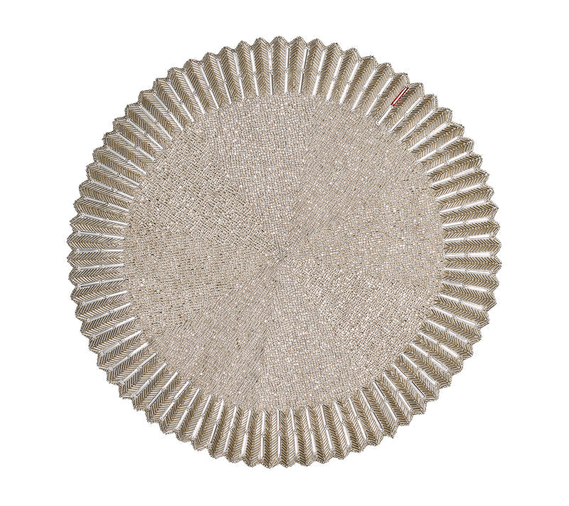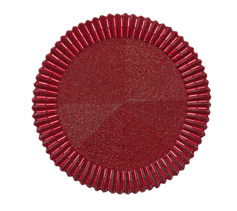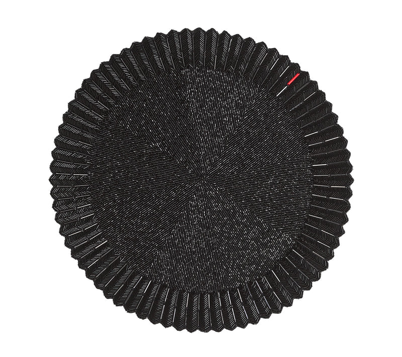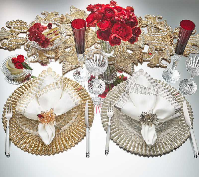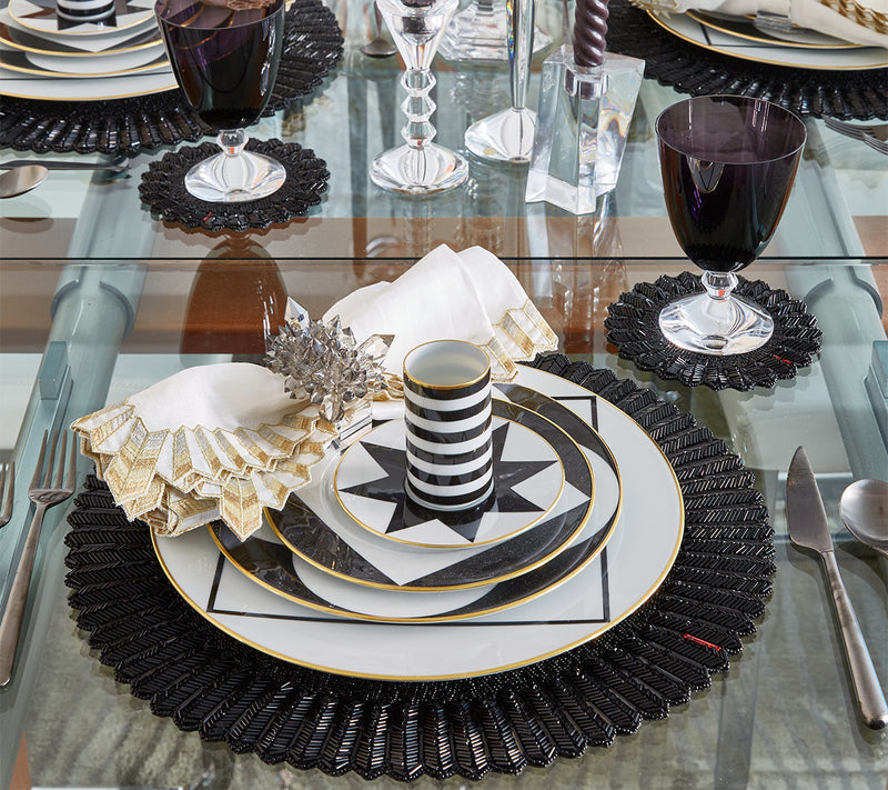 The elegant Baccarat x Kim Seybert Etoile Placemat draws inspiration from the Mille Nuits collection. A mixture of glass beads, gemstones and seed beads in jet creates a three-dimensional ridged edge reminiscent of the classic dinnerware. Emblematic of Baccarat, a signature red accent gemstone adorns the prismatic placemat.