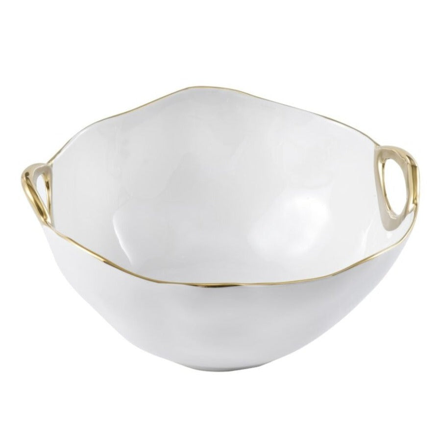 Large Round Bowl in Golden Handles. Generously sized bowl for serving salads, pastas, or side dishes. Stunning white porcelain with smooth and fluent handles in gold titanium.