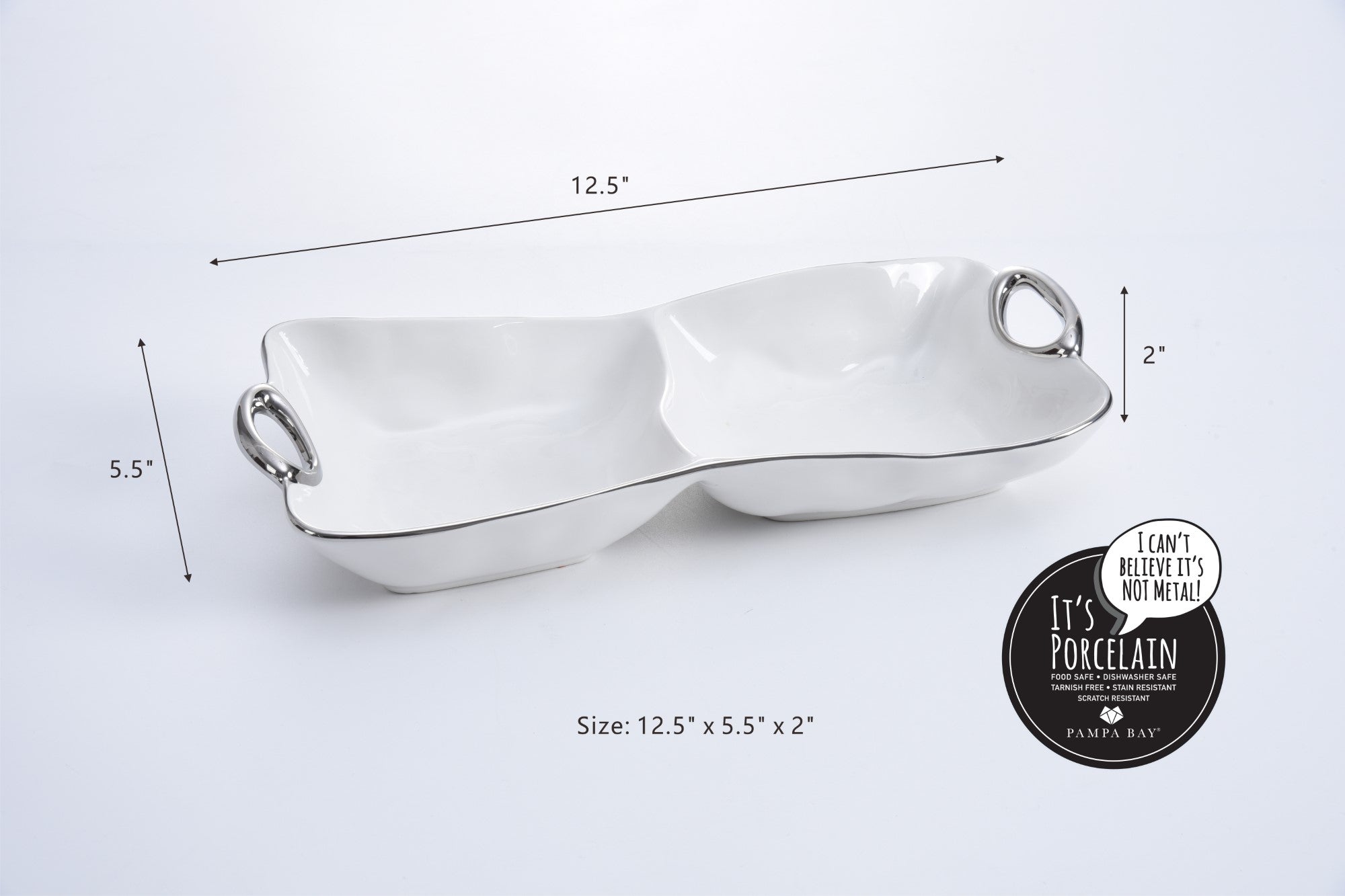 Two-section Server in Handle with Style. Great for serving your favorite pairs! Think chips and dip, hummus and veggies or apples and peanut butter. Stunning white porcelain with smooth and fluent handles in silver titanium. Food safe, dishwasher safe, oven safe to 500°. Easy Care.