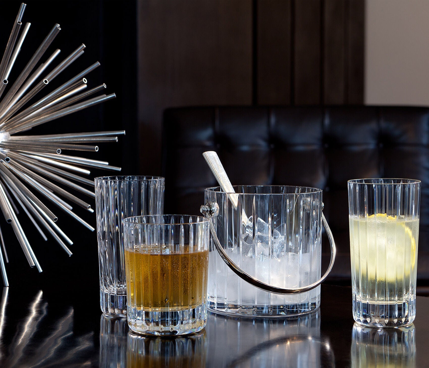 The Harmonie Clear crystal ice bucket has a stainless steel handle and features the sweep of vertical striping characteristic of the Harmonie barware collection. Parallel vertical lines travel cleanly along the silhouette from the lip to the thick base, the streamlined form like a thick Clear crystal column. The stripes are subtly yet precisely etched into the Clear crystal surface of the glass. Not only do they bring a textural quality, but they also create a depth of form that is visually resplendent—all the more so when the bucket is full of cold, glistening ice.
