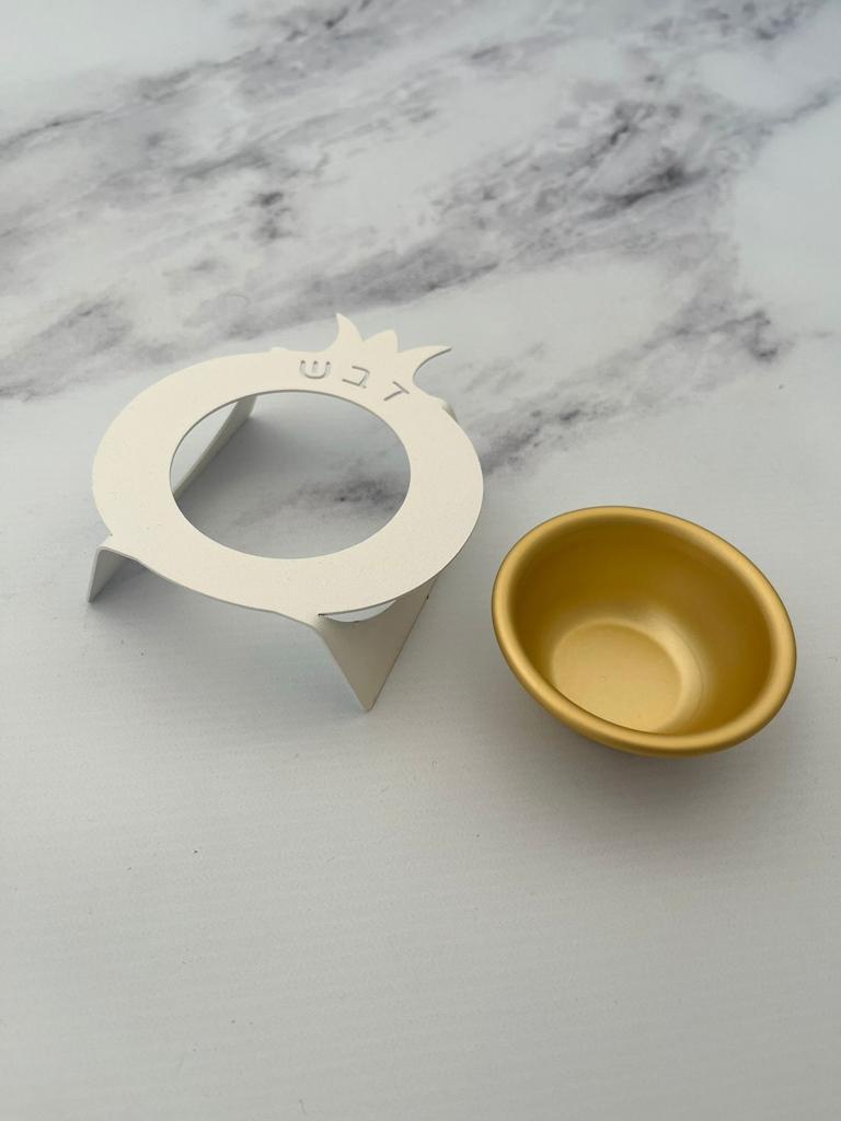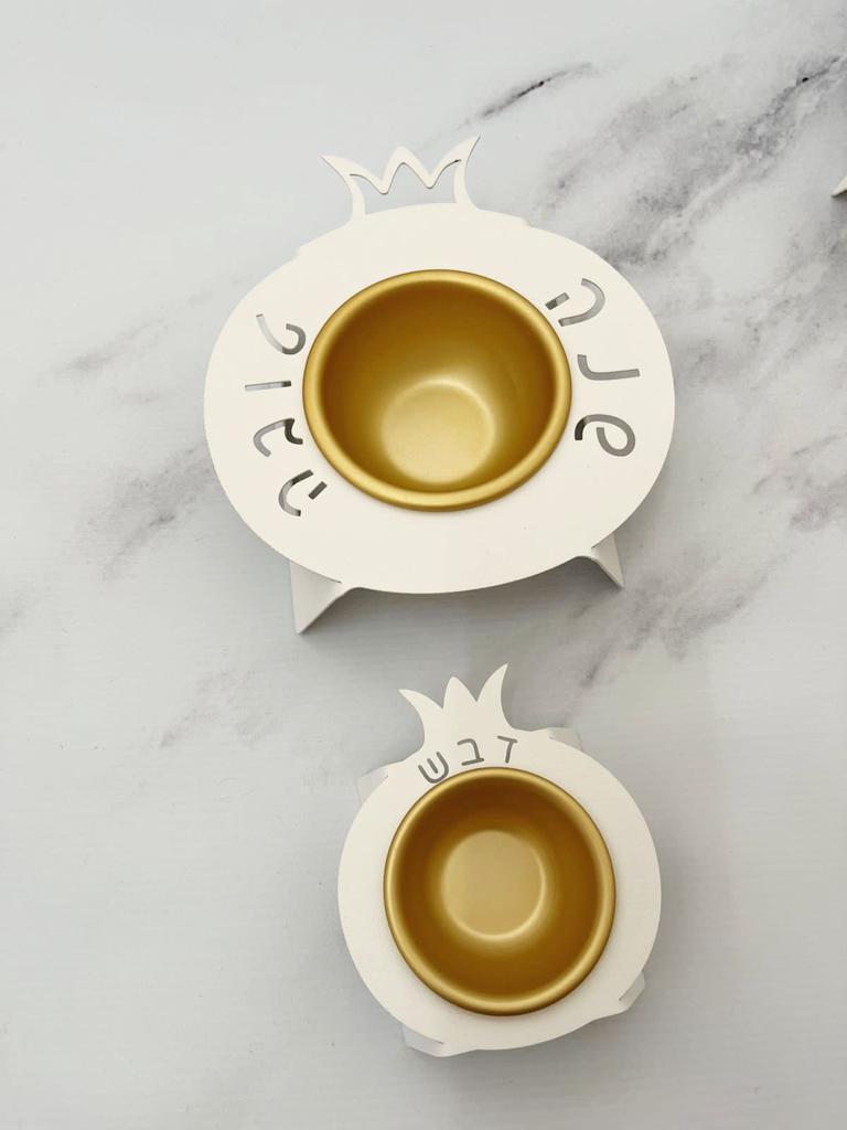 Pomegranate design honey pot with side openwork "Shana Tova",in glow gray metal and anodized golden aluminum bowl.