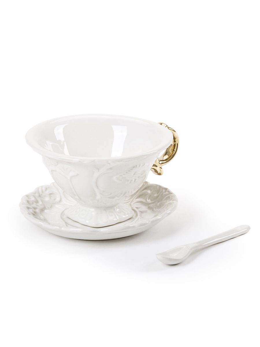 Mugs, tea and coffee sets with a baroque inspiration. Fine opaque porcelain with mat white finishing and fluorescent coloured handles. Brilliant and elegant, the new gold glossy finishing gives to the collection a new sophisticated way of living.