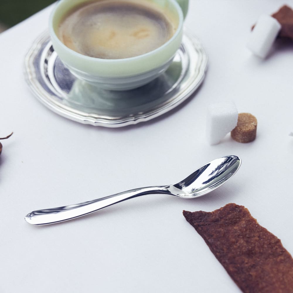 The small universal spoon is shaking up traditions. The bowl is thinner than a coffee spoon to better fit small porcelain cups It is smaller than a traditional coffee spoon, but larger than an espresso spoon, making it totally versatile. Its new size allows the small universal spoon to replace the traditional coffee spoon in our Christofle sets.