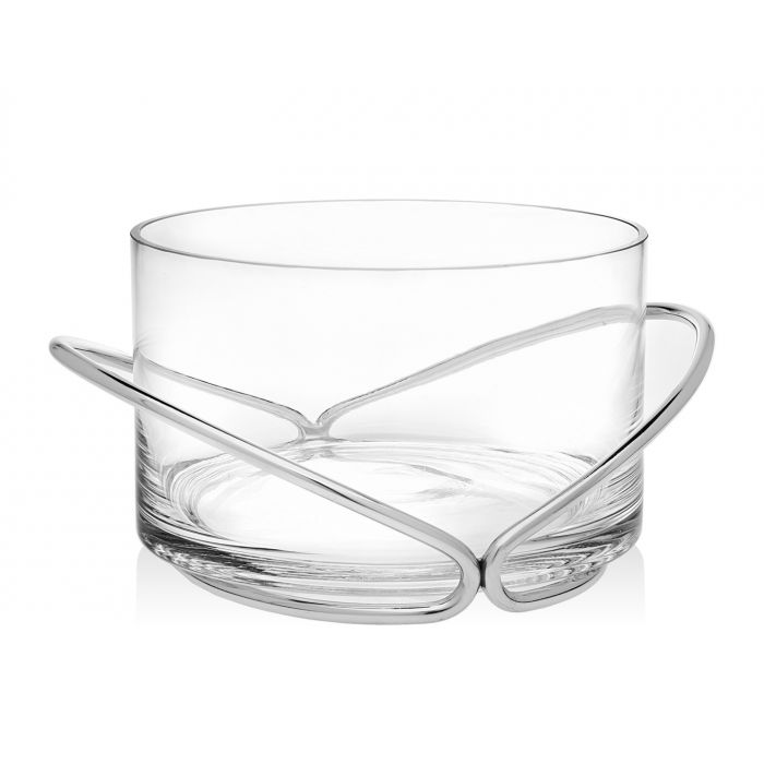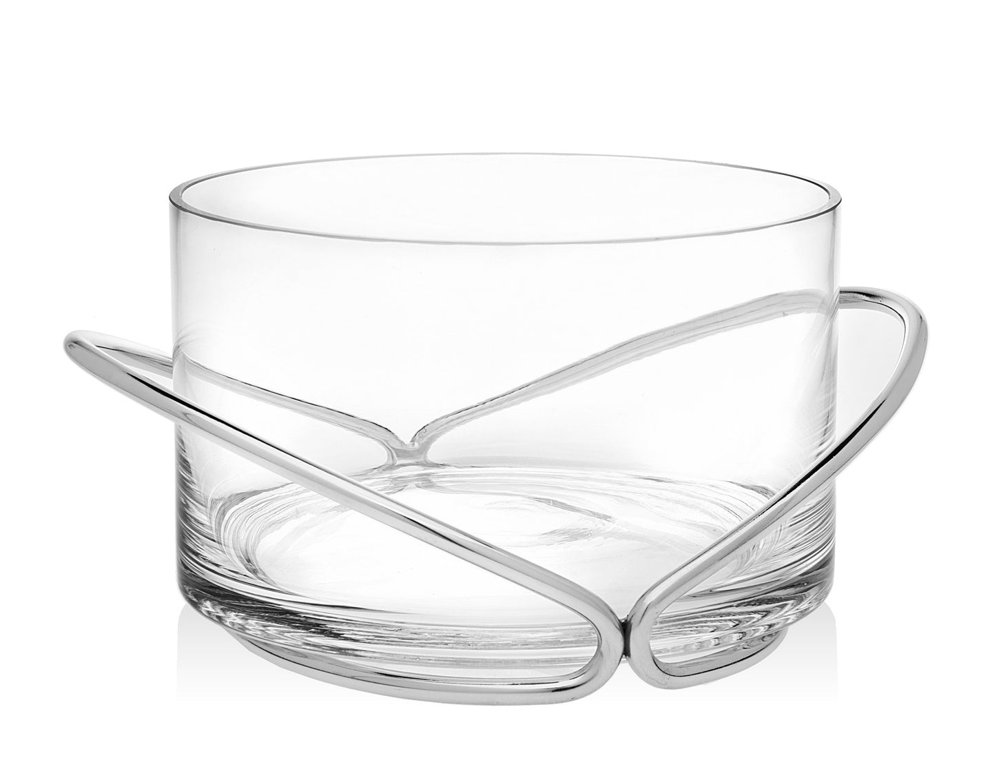 The sleek silhouette of Godinger's glass salad bowl is accented by the abstract artistry of a nickel finish rack that forms a handsome handled support.