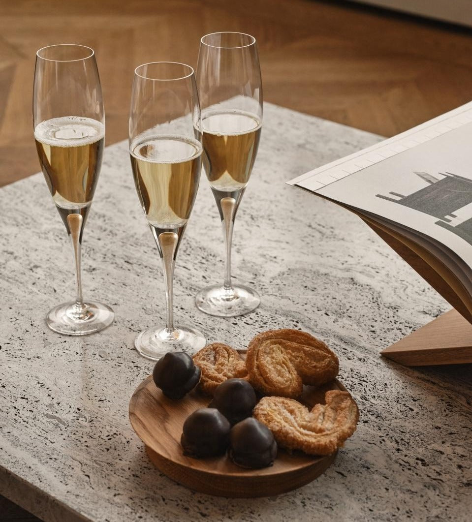 The champagne glass holds 7 oz and is perfect for sparkling beverages such as Champagne, Prosecco, and Cava, with its tall, slim bowl preserving the bubbles in the drink, as well as cocktails such as Mimosa.