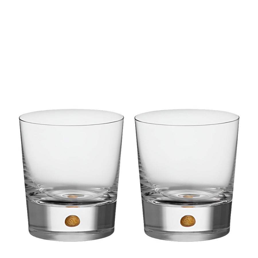 Orrefors craftsmen and Erika Lagerbielke have long tried to fill Intermezzo's characteristic bubble with golden pigment. Finally, it is there, encased in the crystal clear glass – a matte drop shimmering like gold. Intermezzo Double Old Fashioned, holding 13.5oz, was designed in 1984 and is well suited for serving various spirits or cocktails with or without alcohol. It is a large glass with room for a lot of ice, drink mixers, and juices. The glass is mouth-blown in Sweden.