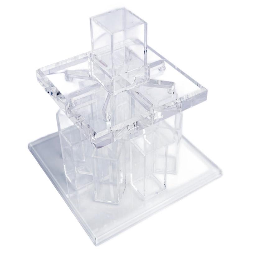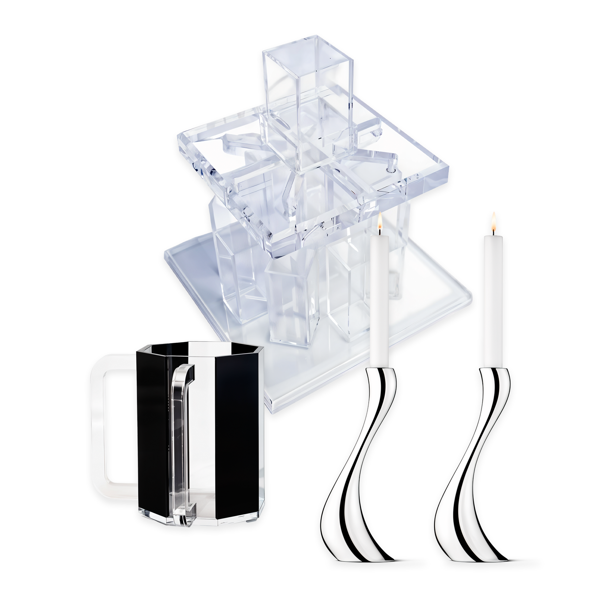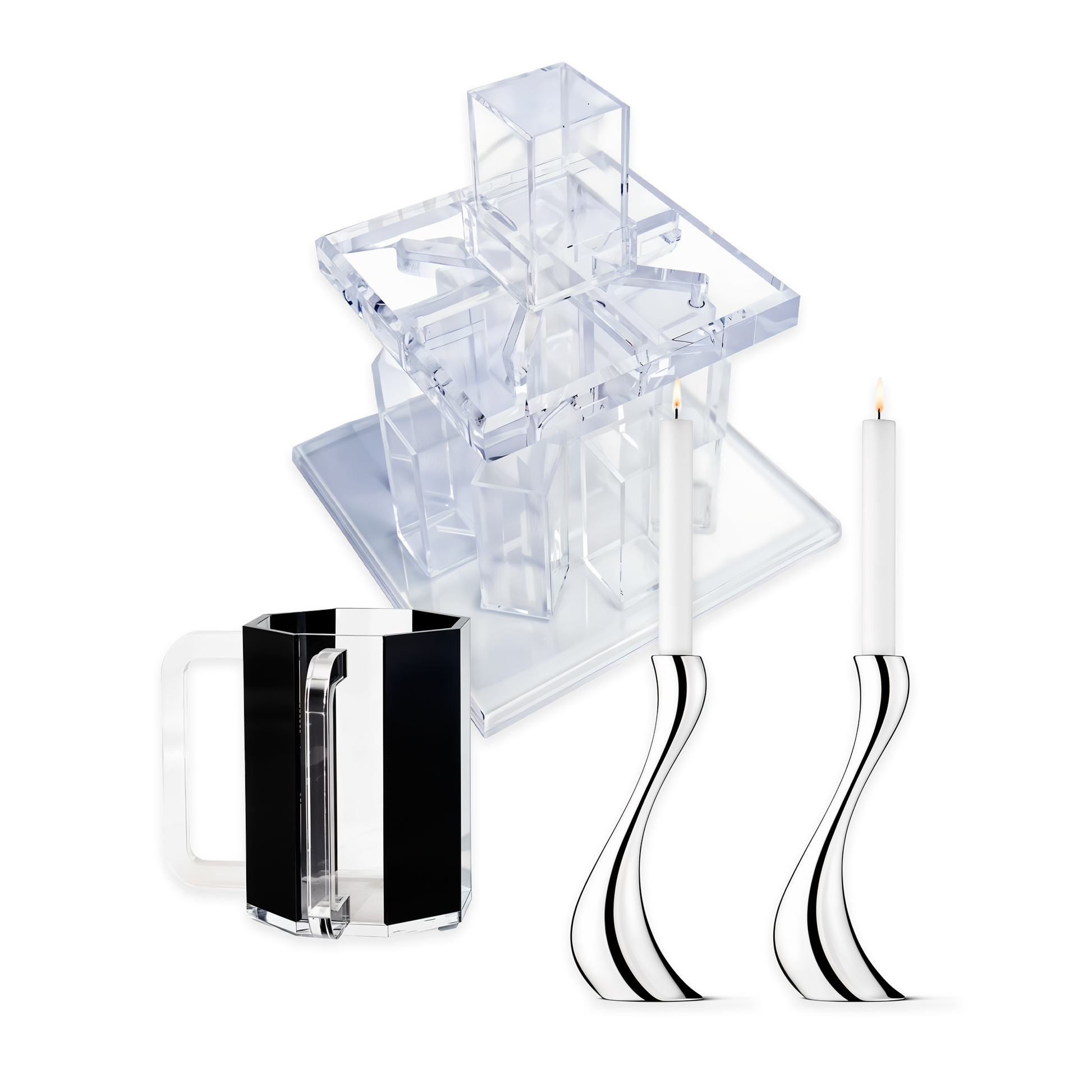 A beautifully curated selection of Passover ritual essentials, this set ensures a meaningful and elegant celebration. The Acrylic Kiddush Wine Fountain allows for a seamless blessing ceremony, the Cobra candlesticks provide a sculptural and modern touch, and the Netilat cup completes the set with a sleek design.