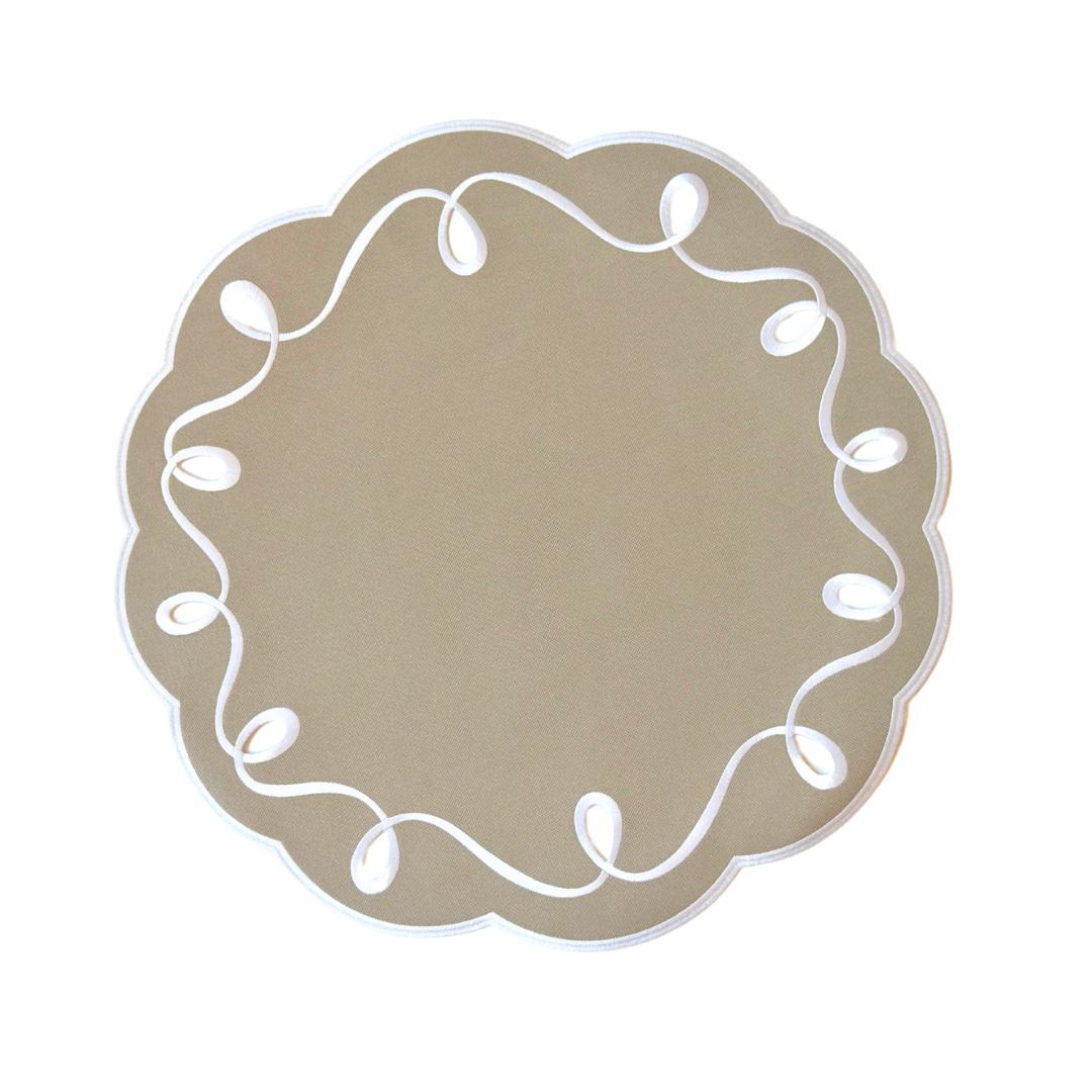 Add effortless sophistication to your table with the Lasso Placemat, where timeless design meets modern functionality. Its elegant scalloped edge and flowing white embroidery bring a touch of refinement to any setting, while the neutral taupe tone pairs beautifully with a variety of dinnerware styles.