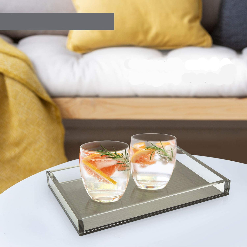 Tizo's Brushed Silver Metallic Lucite Tray features a unique metal bottom, bordered by clear lucite sides. The brushed silver & clear acrylic tray offers the perfect way to showcase bottles of perfume in the bathroom, beverage decanters on a buffet, or other accessories on a coffee table. Dimensions: 12"x 8"