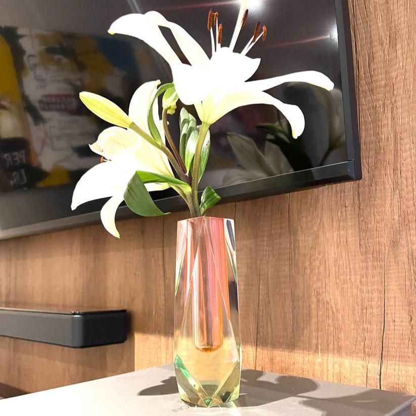 Make a statement with this large acrylic vase, designed to change hue with every glance. The vibrant yellow and pink tones create a bold and colorful centerpiece, perfect for adding a touch of iridescent elegance to any room.