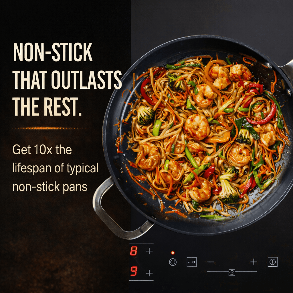 Wide, straight sides create 20% more cooking space than a skillet — perfect for stir-fries, pastas, or family-sized meals.