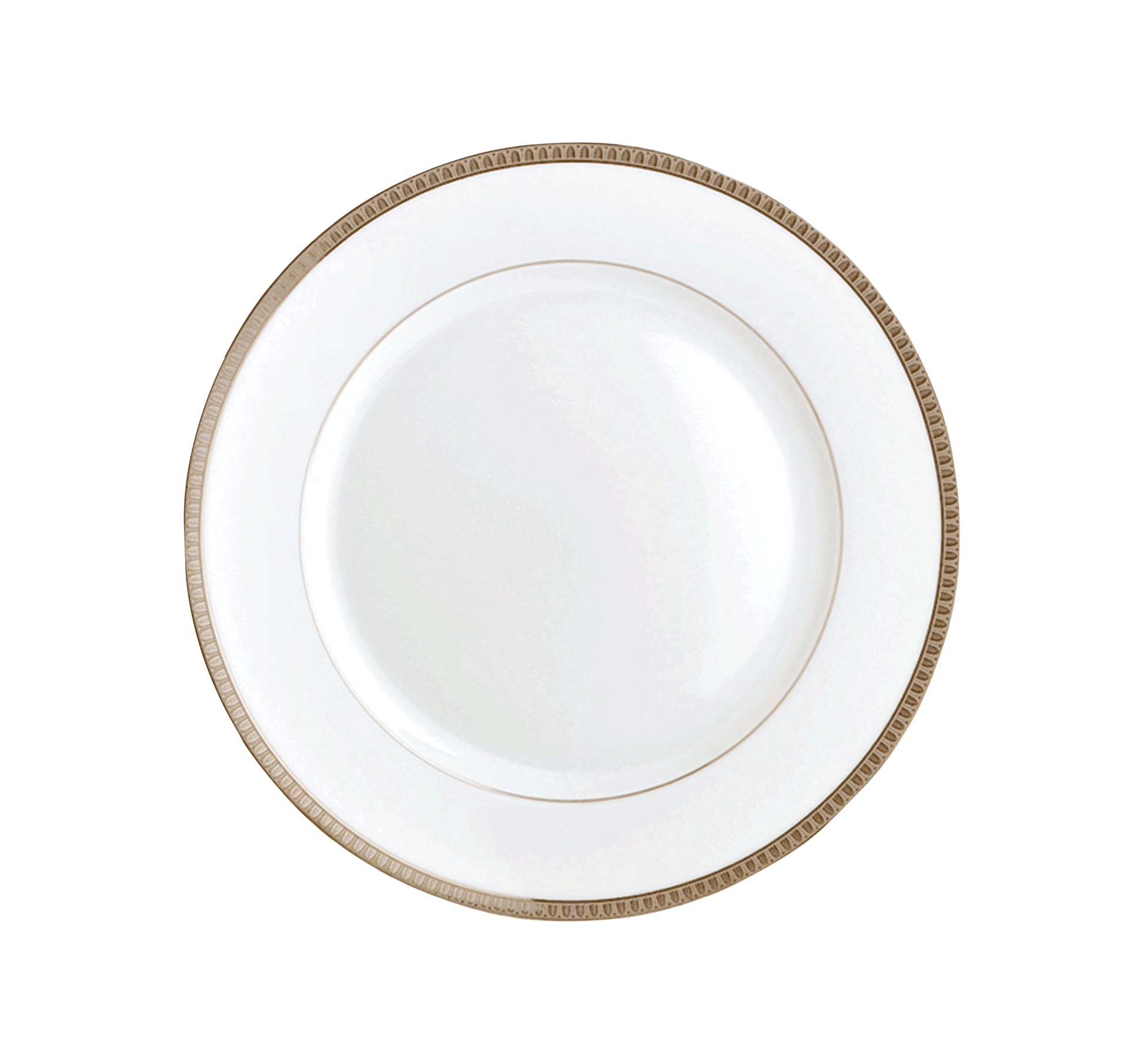 The Limoges porcelain dessert plate in the Malmaison pattern has a platinum frieze around the rim and can be used to serve starters, salads, desserts or cheese courses. One of Christofle's most historic patterns, Malmaison typifies the Empire style, with its frieze of delicate palm and lotus leaves and symmetrical design. The name is a nod to the Chateau de la Malmaison, a favored Parisian residence of Napoleon Bonaparte and Empress Josephine.