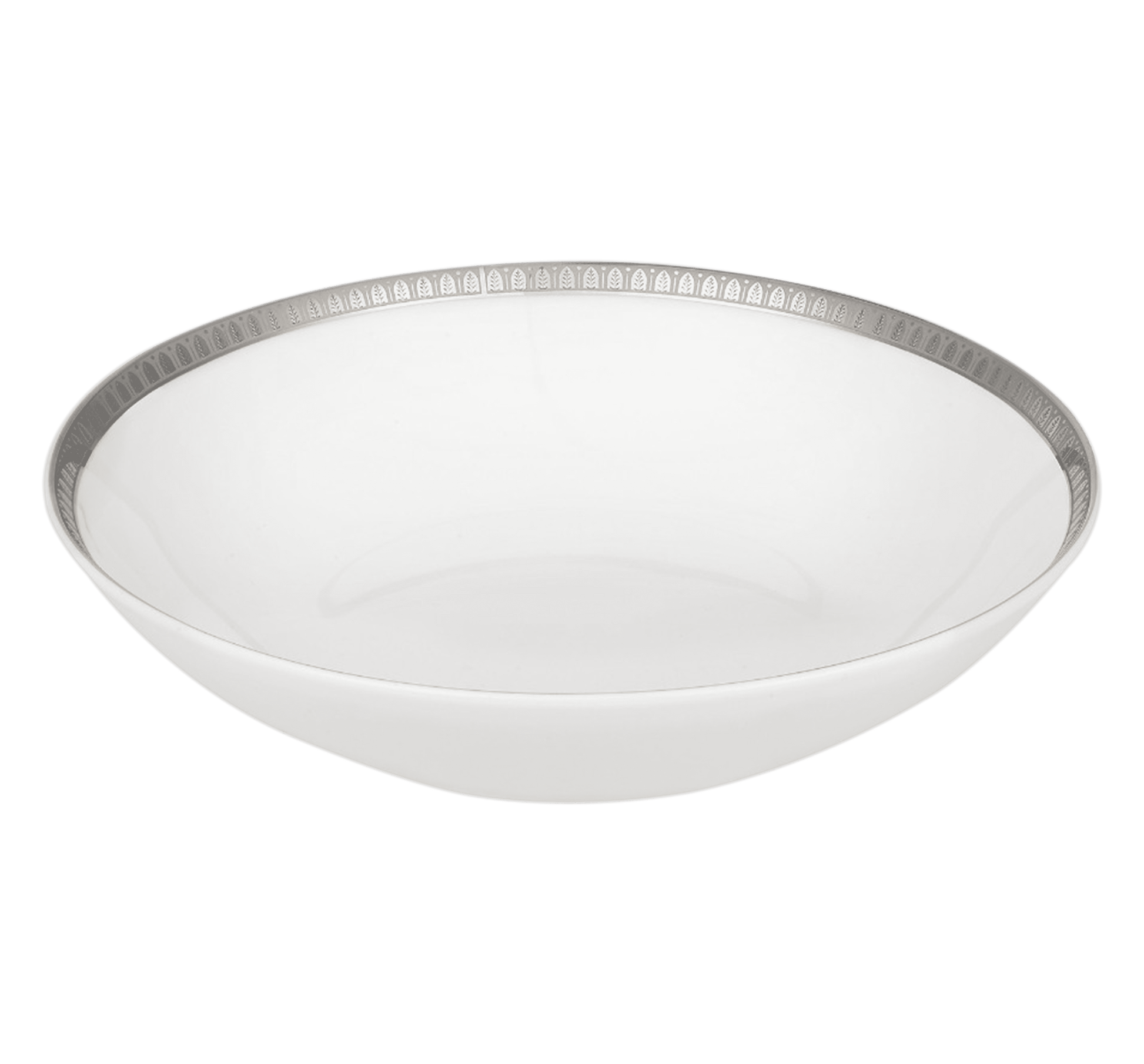 The Limoges porcelain soup bowl in the Malmaison pattern has a platinum frieze around the rim and is perfect for soups, cereal and fruit. One of Christofle's most historic patterns, Malmaison typifies the Empire styles, with its frieze of delicate palm and lotus leaves and symmetrical design