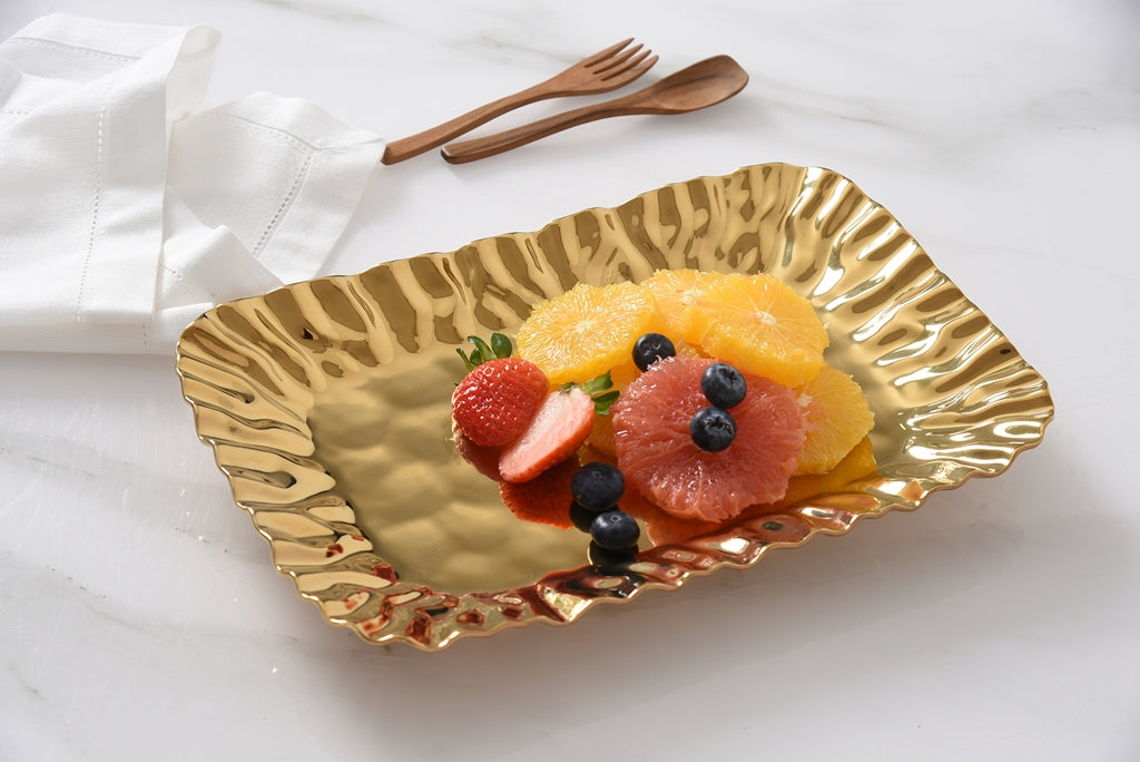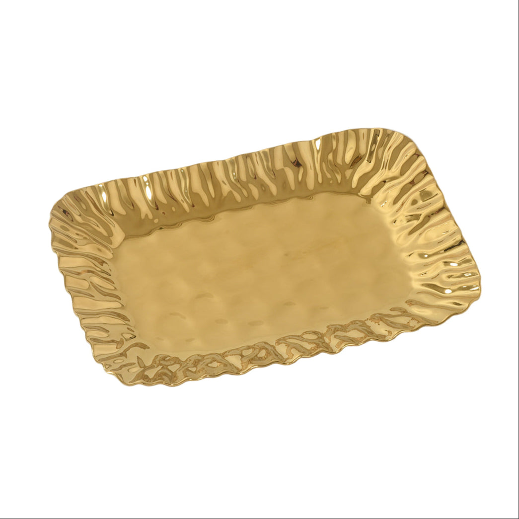 Small Deep Tray in Mascali D’oro. Perfect for tempting guests with your delicious main course or hearty sides. Use for dessert to display an assortment of treats and sweets! Striking and elegant gold-tone finished high-fired porcelain.