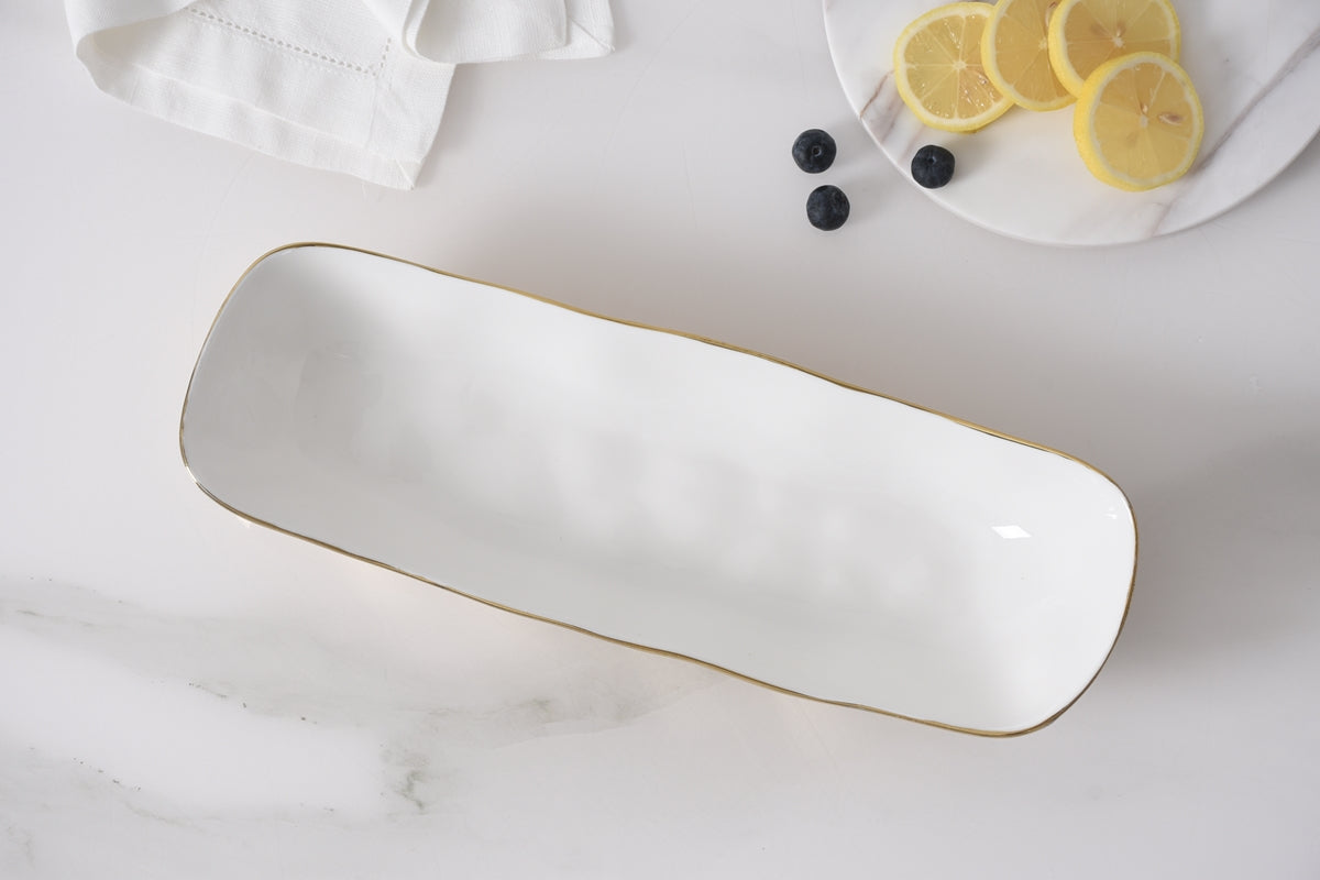 Deep Rectangular Server from our Moonlight Collection. Perfect for presenting bread, asparagus, green beans, crackers, or cookies. Looks great as a decorative accessory with fresh fruits or lemons! Crafted in a luxurious white high-fired porcelain and dazzling gold exterior.