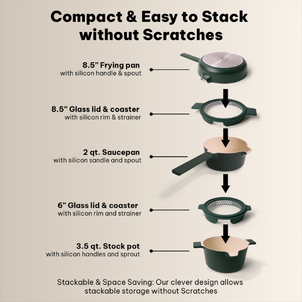 - Stacks neatly into one single pot. No clutter, no chaos—just clean counters and calm cabinets.
