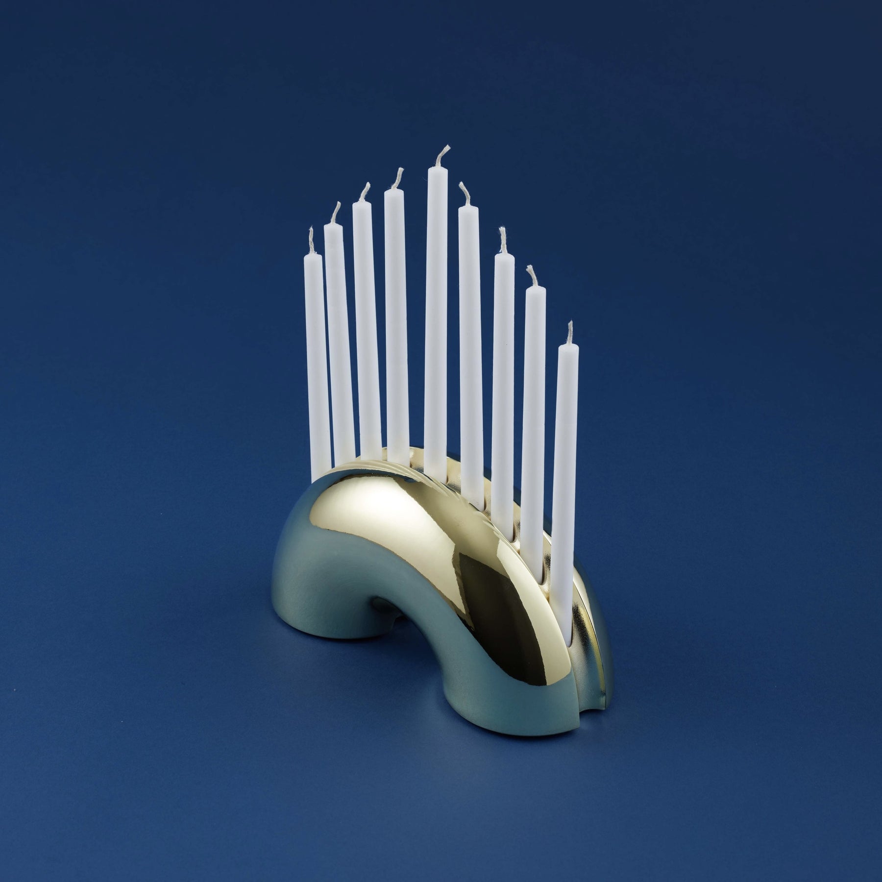 The Brass Nosh Menorah is made of high quality metal, plated and polished to a mirror finish. The two feet each feature a soft cork pad for stability.