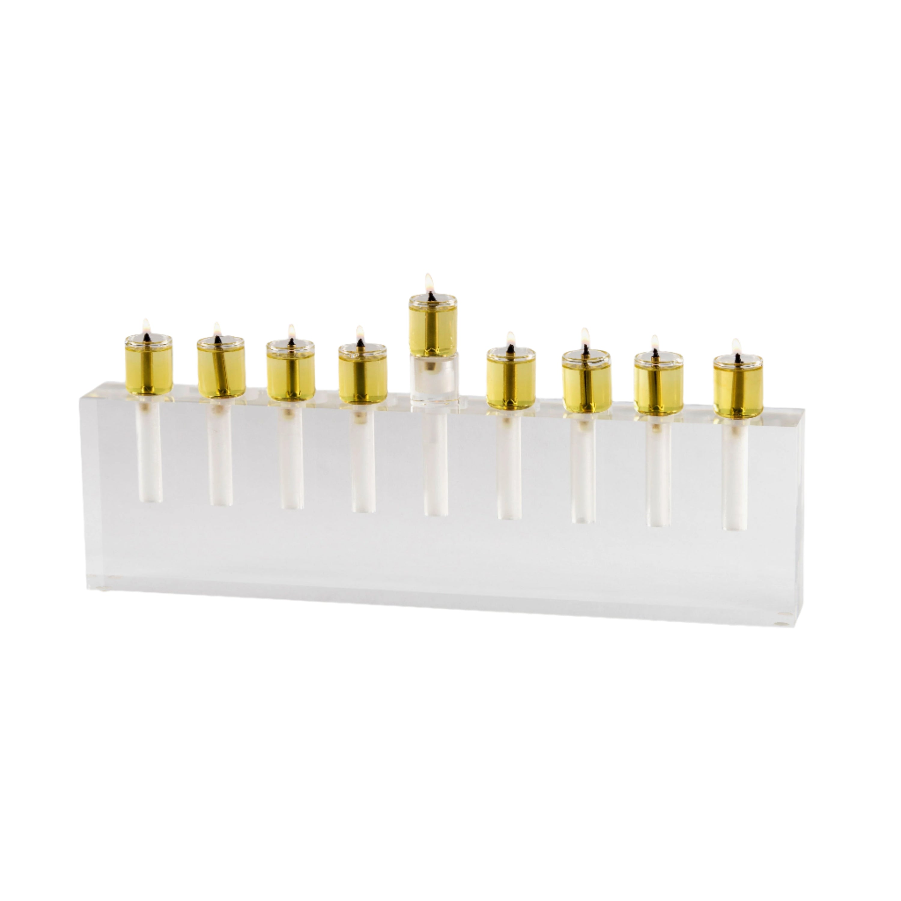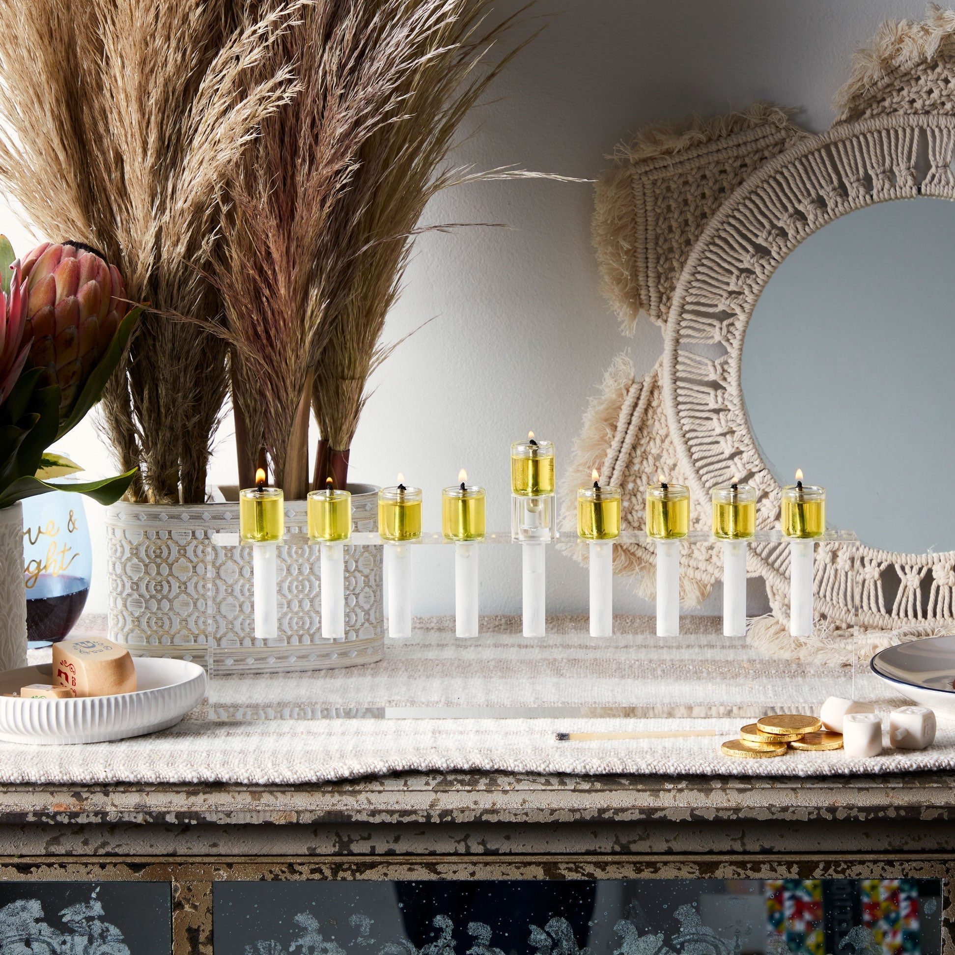 Customize the placement of the shamash! The oil lamp menorah's shamash is a removable acrylic piece that can be placed in the center, on the left holder, or left off entirely.