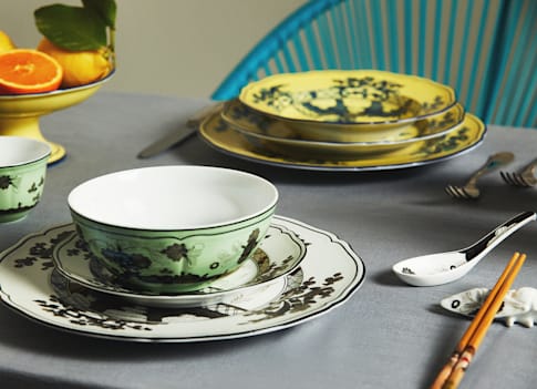 bread plates are made of fine porcelain in which citrine yellow dominates the entire surface and enhances the contrasting floral motif. They are designed in combination with other elements of the same collection, either to create sophisticated tone-on-tone tables and original colour mixes or to offer a distinctive element in contrast with other Ginori 1735 collections.