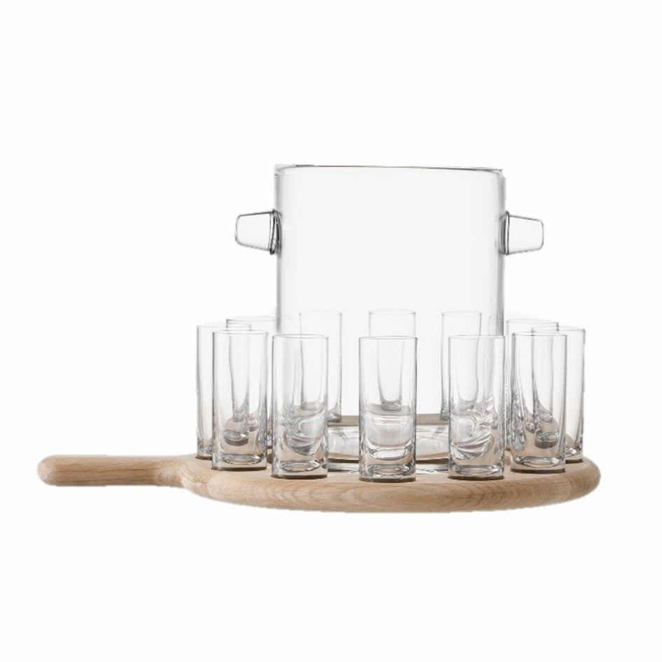 A mixed material party centrepiece. Twelve shot glasses nestle securely around the tall ice bucket in the centre. The round paddle has a slim handles at one end. For chilling and serving vodka.